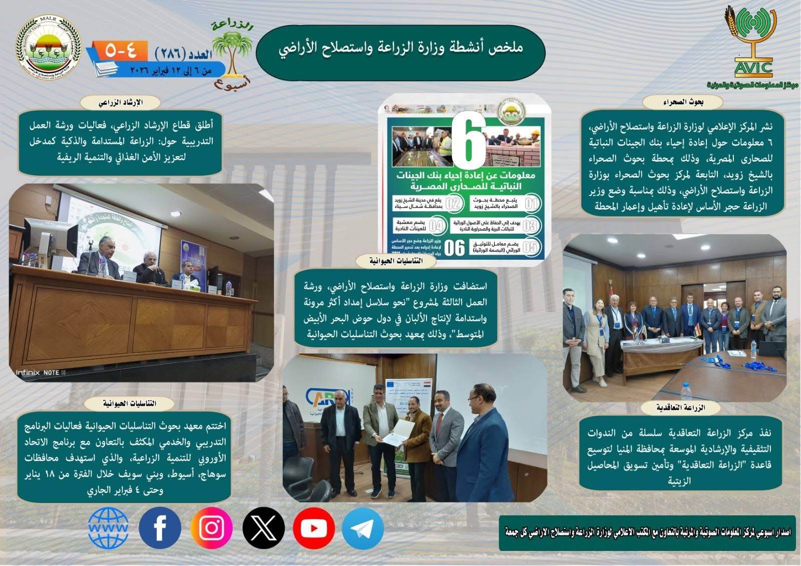 وتلقى علاء فاروق وزير الزراعة واستصلاح الأراضي، تقريرا من الدكتور أحمد عضام رئيس لجنة تقاوي الحاصلات الزراعية، استعرض فيه أبرز جهود وأعمال اللجنة خلال عام 2025، بينما نشر المركز الإعلامي لوزارة الزراعة واستصلاح الأراضي، 6 معلومات حول إعادة إحياء بنك الجينات النباتية للصحارى المصرية، وذلك بمحطة بحوث الصحراء بالشيخ زويد، التابعة لمركز بحوث الصحراء بوزارة الزراعة واستصلاح الأراضي، وذلك بمناسبة وضع وزير الزراعة حجر الأساس لإعادة تأهيل وإعمار المحطة. وأطلق قطاع الإرشاد الزراعي، فعاليات ورشة العمل التدريبية حول: الزراعة المستدامة والذكية كمدخل لتعزيز الأمن الغذائي والتنمية الريفية، بينما استضافت وزارة الزراعة واستصلاح الأراضي، ورشة العمل الثالثة لمشروع "نحو سلاسل إمداد أكثر مرونة واستدامة لإنتاج الألبان في دول حوض البحر الأبيض المتوسط"، وذلك بمعهد بحوث التناسليات الحيوانية.