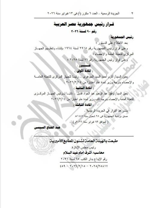أصدر السيد الرئيس عبد الفتاح السيسى، القرار رقم 90 لسنة 2026 بتعيين أكرم أحمد السيد الجوهرى، رئيسًا للجهاز المركزى للتعبئة العامة والإحصاء بدرجة وزير لمدة عام اعتبارًا من ٢٠٢٦/٢/١٤ .