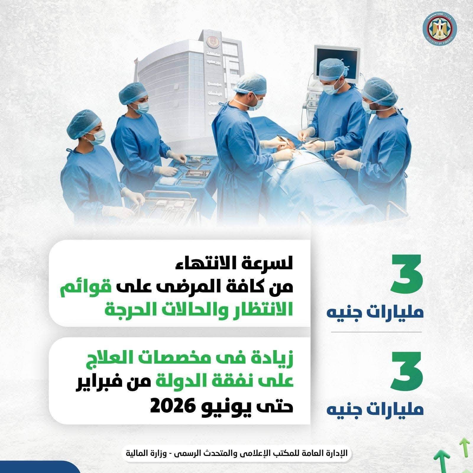 وأشار وزير المالية إلى أن هناك ٣ مليارات جنيه لسرعة الانتهاء من قوائم انتظار المرضى والحالات الحرجة لتخفيف آلامهم وأسرهم، موضحًا أن هناك ٣ مليارات جنيه زيادة أيضًا في مخصصات العلاج على نفقة الدولة لمحدودي الدخل، ممن ليس لهم تغطية تأمينية في الفترة من فبراير حتى يونيو ٢٠٢٦، موضحا أن الرئيس وجه بعلاج كل الحالات الحرجة على نفقة الدولة حتى نحتفل بشفائها مع حلول عيد الفطر.