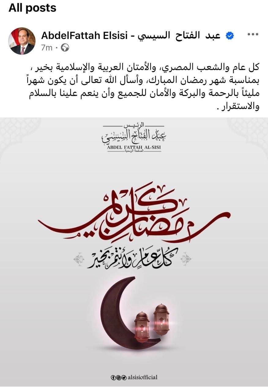وقال الرئيس السيسي - في تدوينة له على صفحته الرسمية على موقع التواصل الاجتماعي "فيسبوك" - "كل عام والشعب المصري، والأمتان العربية والإسلامية بخير ، بمناسبة شهر رمضان المبارك، وأسأل الله تعالى أن يكون شهراً مليئاً بالرحمة والبركة والأمان للجميع وأن ينعم علينا بالسلام والاستقرار".