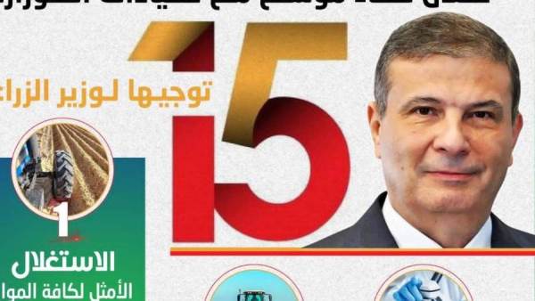 وأكد على ضرورة أن تشمل خطط العمل خلال الفترة المقبلة: تفعيل دور الإرشاد الزراعي والنزول للمزارعين في الحقول، فضلا عن تطوير منظومة الزراعة الآلية وتقديم الخدمات بأسعار مناسبة، إضافة الى التوسع في إقامة منافذ بيع المنتجات والسلع الغذائية بأسعار مخفضة لتقليل الحلقات الوسيطة وتخفيف العبء عن المواطنين، إضافة إلى تكثيف الجهود في ملف إزالة التعديات على الأراضي الزراعية باعتبارها خطاً أحمر.