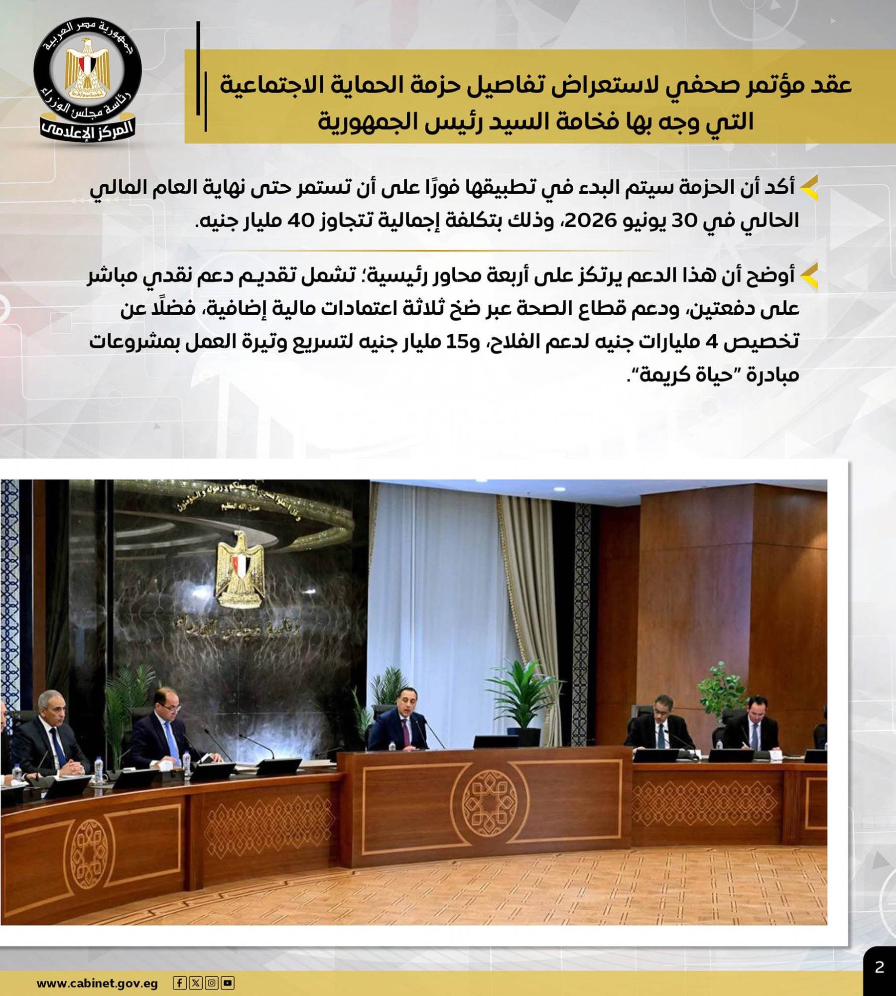 - بتكلفة تتجاوز 40 مليار جنيه.. رئيس الوزراء: تنفيذ حزمة الحماية الاجتماعية فورًا وفقًا لتوجيهات فخامة الرئيس