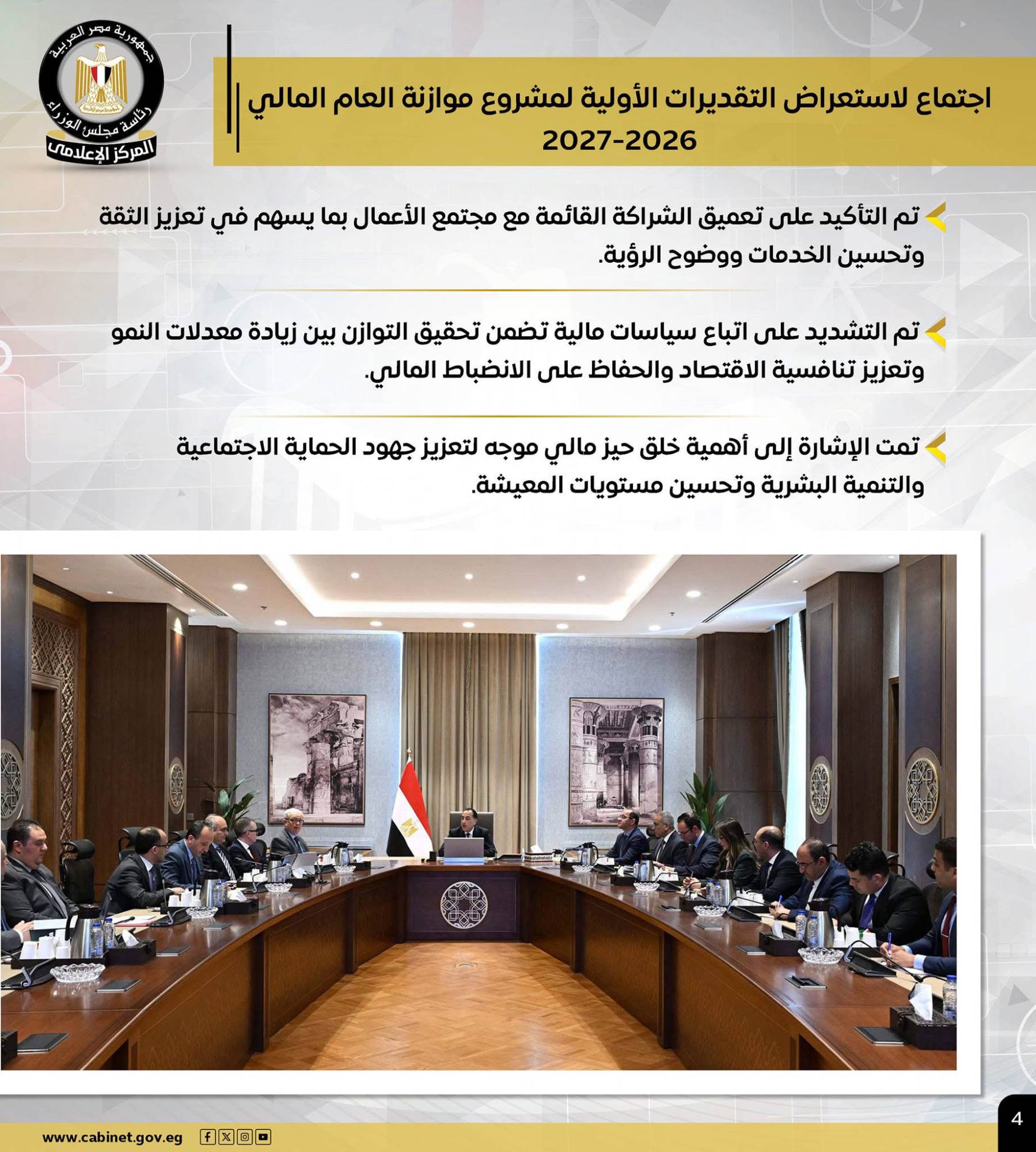- رئيس الوزراء يستعرض التقديرات الأولية لمشروع موازنة العام المالي 2026-2027