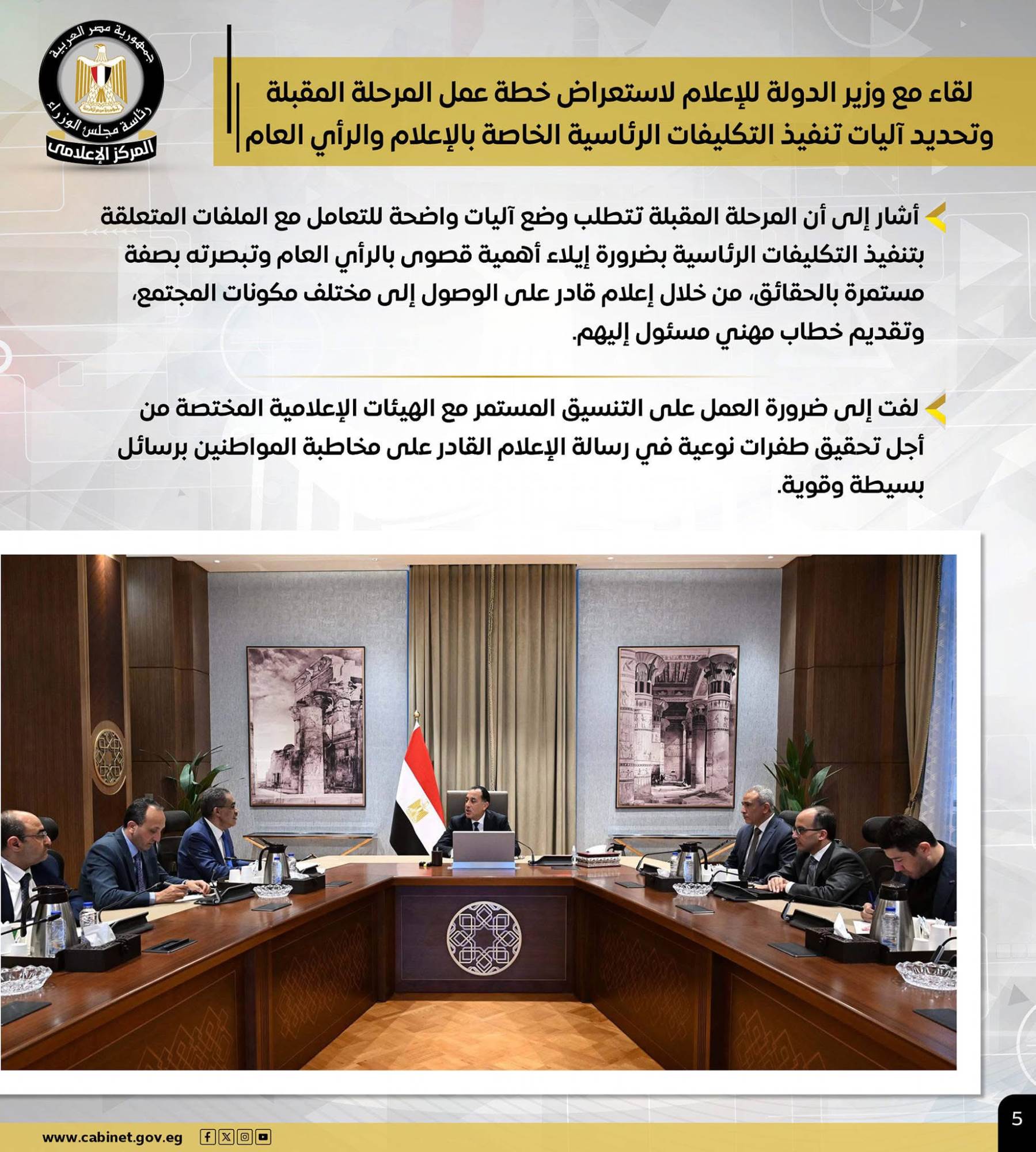 - خلال لقائه مع وزير الدولة للإعلام.. رئيس الوزراء يستعرض آليات تنفيذ التكليفات الرئاسية الخاصة بالإعلام والرأي العام