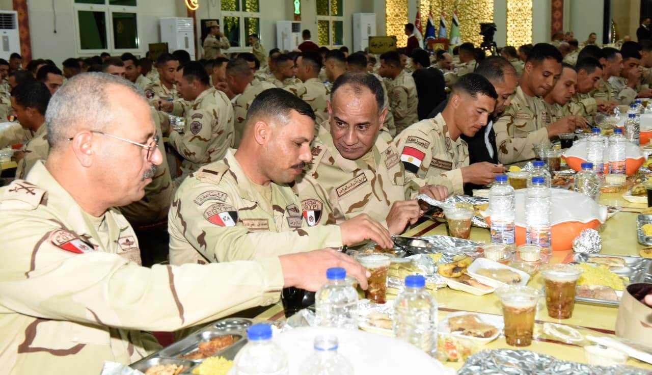 الفريق أشرف سالم زاهر القائد العام للقوات المسلحة وزير الدفاع والإنتاج الحربى يشارك عدداً من مقاتلى القوات المسلحة بقيادة الجيش الثانى الميدانى تناول وجبة الإفطار