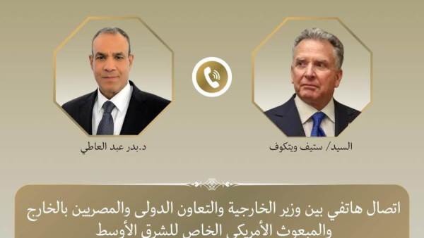 جرى اتصال هاتفى بين د. بدر عبد العاطي وزير الخارجية والتعاون الدولي والمصريين بالخارج و "ستيف ويتكوف" المبعوث الأمريكي الخاص للشرق الأوسط يوم الجمعة ٢٧ فبراير، وذلك في إطار التنسيق والتشاور المستمر بين مصر والولايات المتحدة إزاء القضايا الإقليمية ذات الاهتمام المشترك.