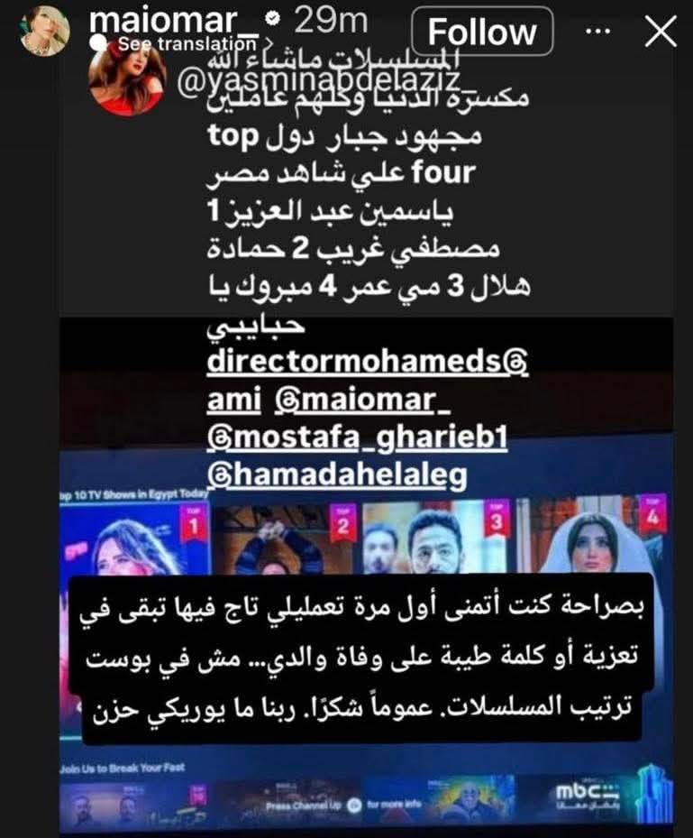ردت الفنانة ياسمين عبد العزيز على تصريحات الفنانة مي عمر بعد عتابها لها بسبب الإشارة إليها في منشور يتعلق بترتيب المسلسلات الأعلى مشاهدة خلال موسم دراما رمضان. وكانت مي عمر قد علّقت عبر حسابها على موقع “إنستجرام”، معبرة عن استيائها من ذكر اسمها في منشور يخص ترتيب المسلسلات، قائلة: «بصراحة كنت أتمنى أول مرة تعمليلي تاج فيها تبقى في تعزية أو كلمة طيبة على وفاة والدي، مش في بوست ترتيب المسلسلات.. عموماً شكراً، ربنا ما يوريكي أحزان».