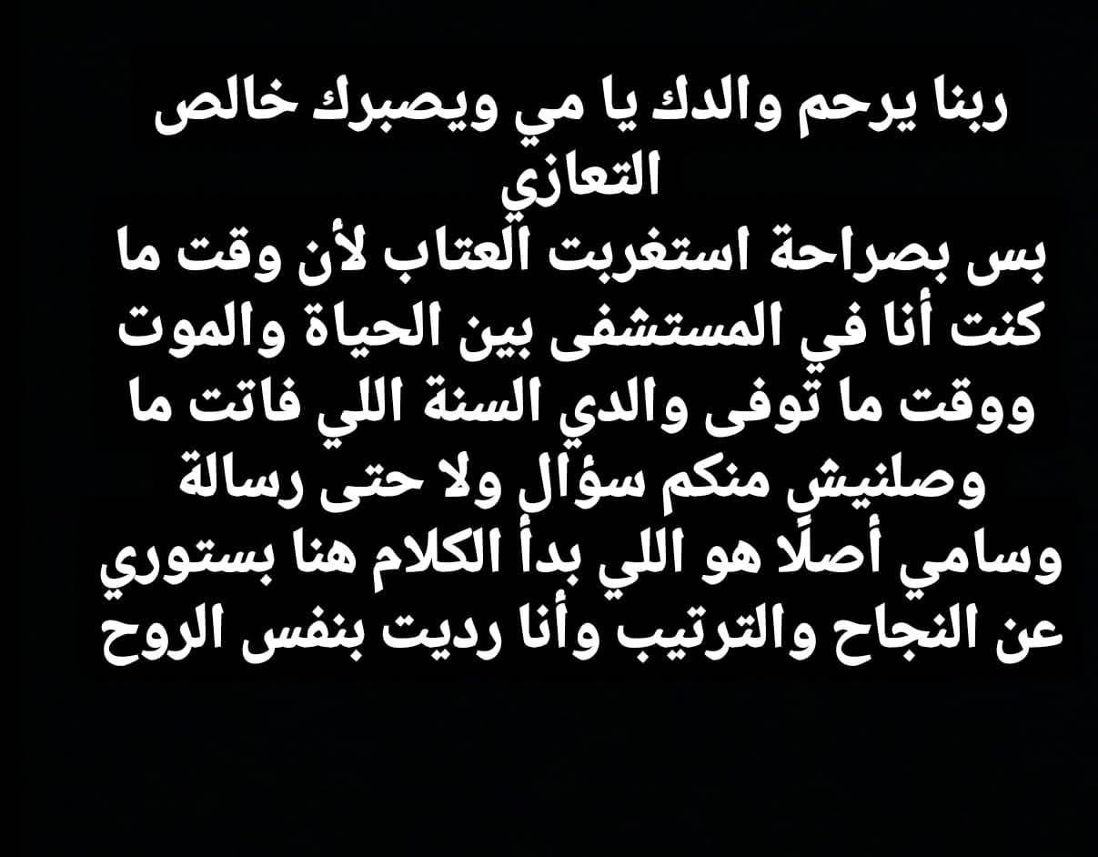 وقالت ياسمين عبد العزيز: «ربنا يرحم والدك يا مي ويصبرك، خالص التعازي.. بس بصراحة استغربت العتاب لأن وقت ما كنت أنا في المستشفى بين الحياة والموت ووقت ما توفى والدي السنة اللي فاتت ما وصلنيش منكم سؤال ولا حتى رسالة، وسامي أصلاً هو اللي بدأ الكلام هنا بستوري عن النجاح والترتيب وأنا رديت بنفس الروح».