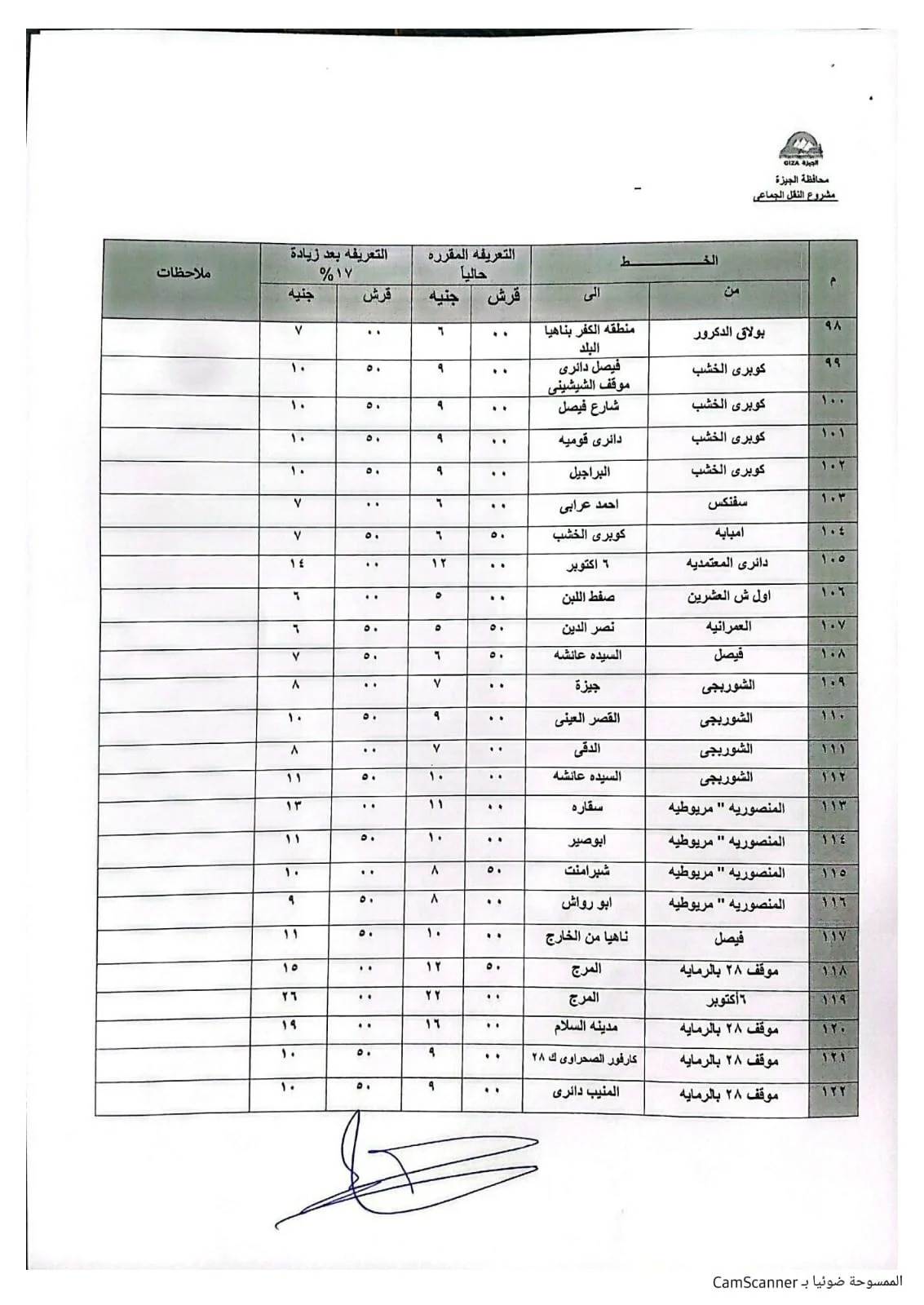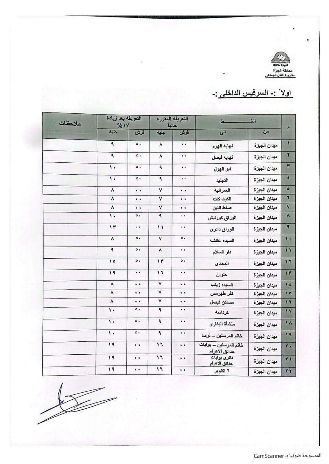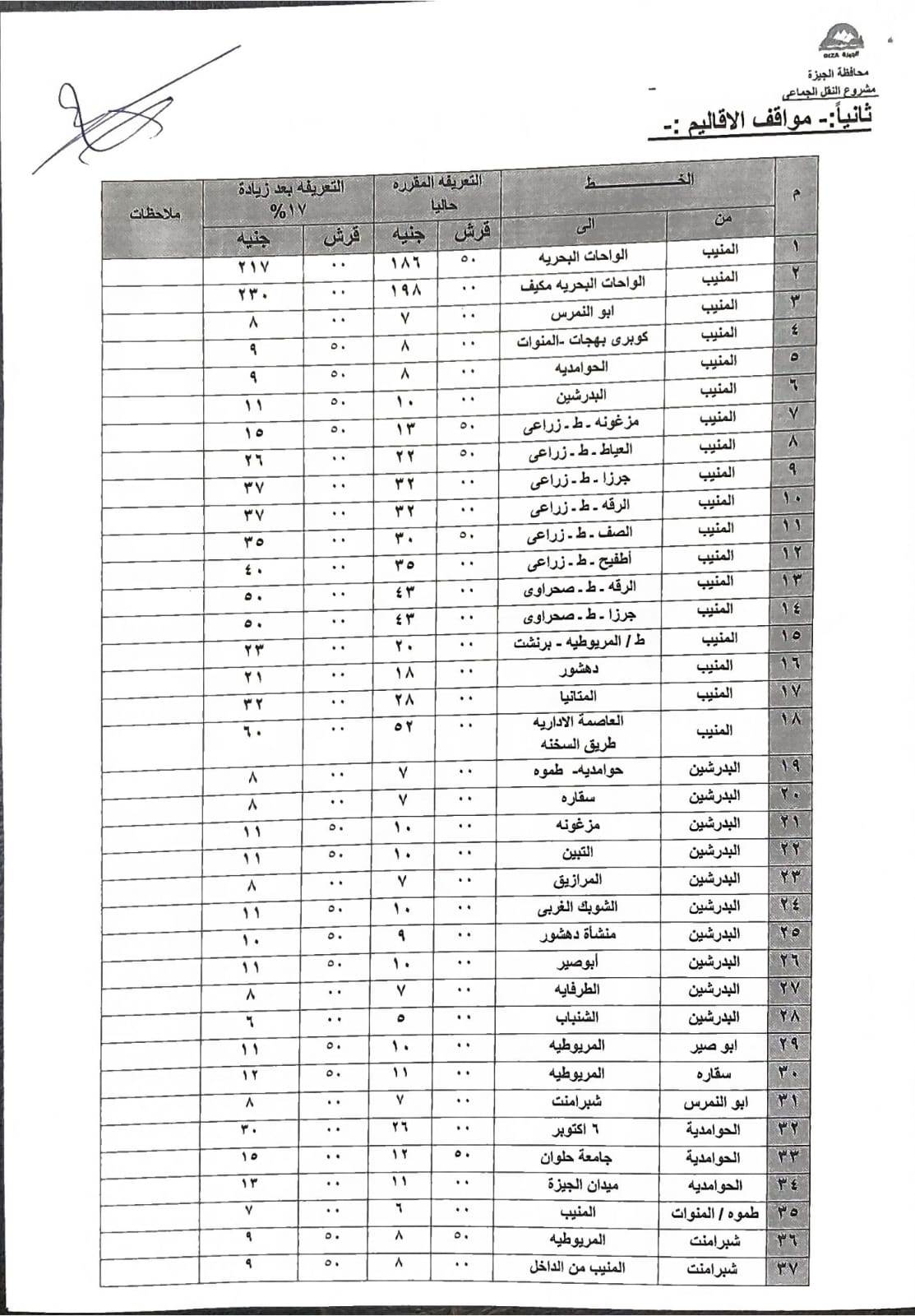 ووجه محافظ الجيزة الأجهزة المعنية من جهاز السرفيس وإدارة المرور ورؤساء الأحياء والمراكز ومسؤولي التموين، بالرقابة والمتابعة على مدار الساعة للتأكد من الإلتزام بالتعريفة الجديدة وعدم استغلال المواطنين.