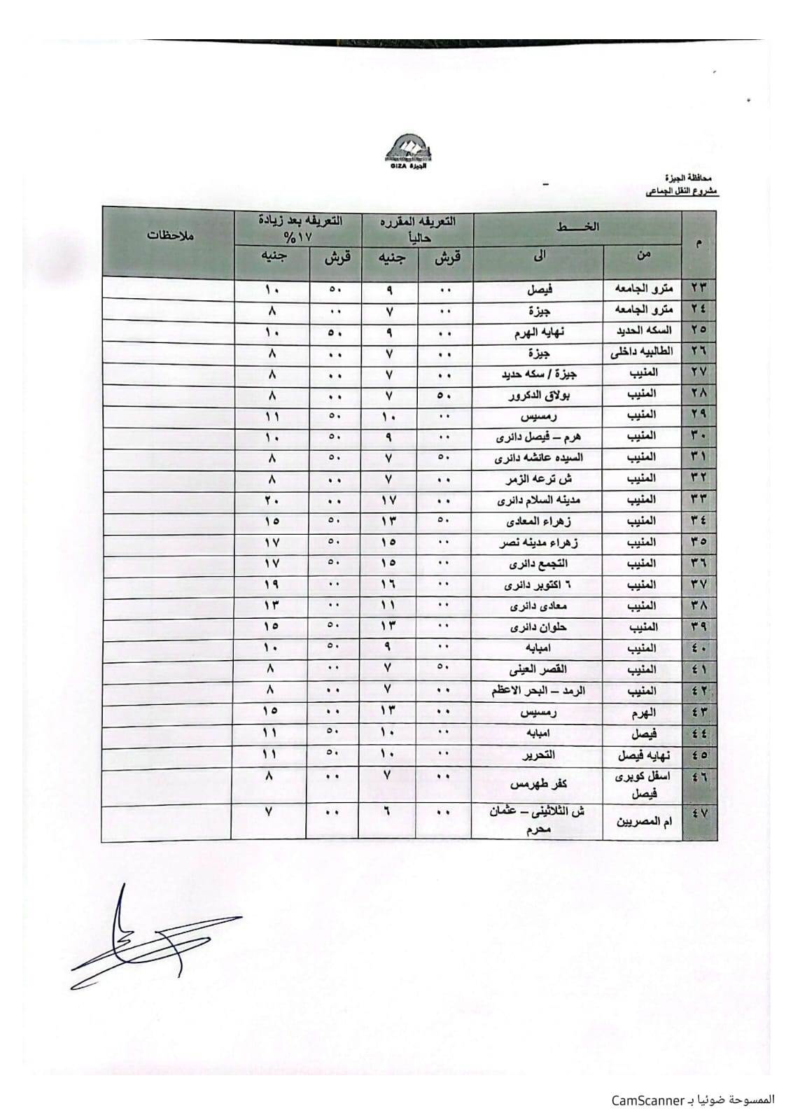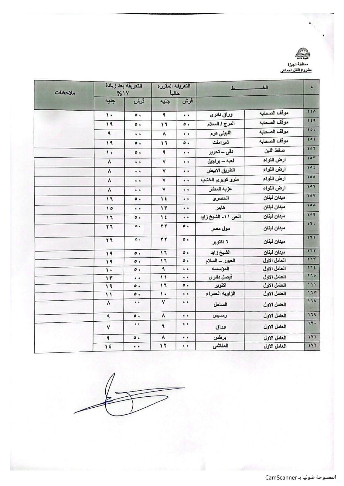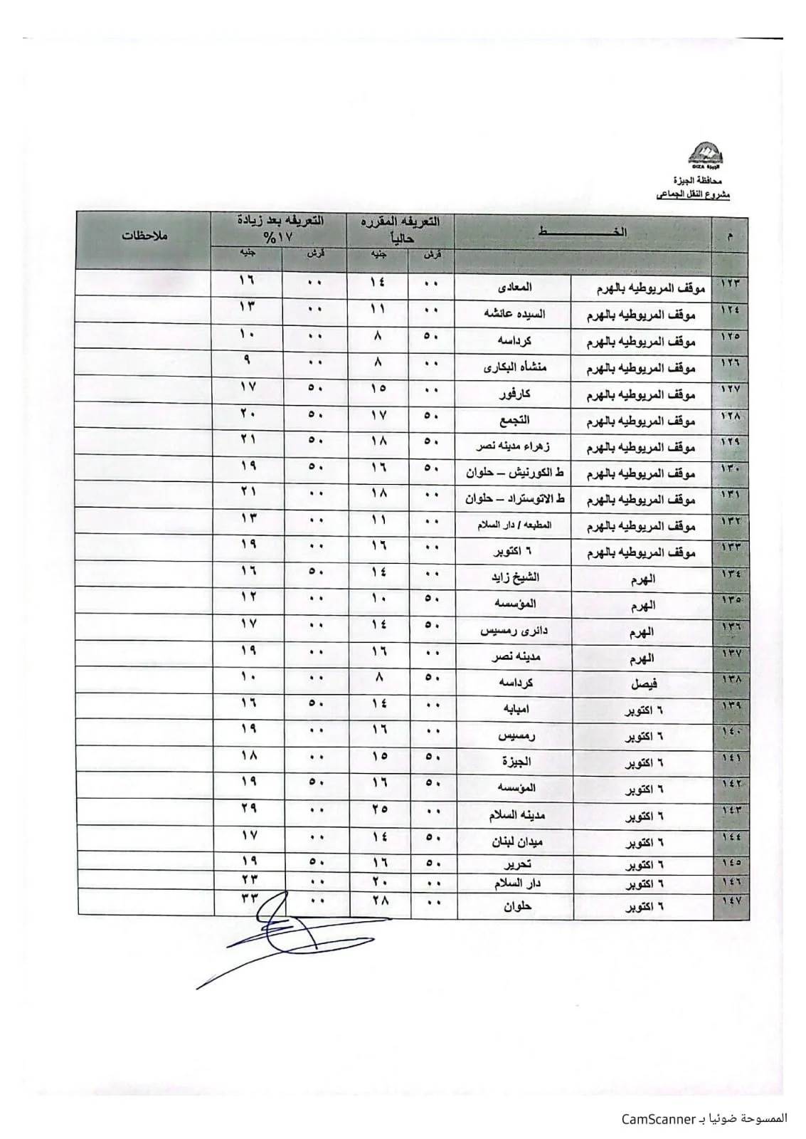 ووجه محافظ الجيزة الأجهزة المعنية من جهاز السرفيس وإدارة المرور ورؤساء الأحياء والمراكز ومسؤولي التموين، بالرقابة والمتابعة على مدار الساعة للتأكد من الإلتزام بالتعريفة الجديدة وعدم استغلال المواطنين.