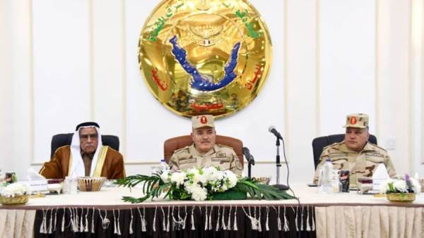 ونقل اللواء أ ح / هشام فتحى شندى قائد قوات شرق القناة لمكافحة الإرهاب تحيات وتقدير الفريق / أشرف سالم زاهر القائد العام للقوات المسلحة وزير الدفاع والإنتاج الحربى والفريق / أحمد خليفة رئيس أركان حرب القوات المسلحة لشيوخ وعواقل سيناء ، مشيراً إلى حرص القوات المسلحة على تقديم كافة أوجه الدعم لأبناء محافظتى شمال وجنوب سيناء والتعاون المستمر مع كافة مؤسسات الدولة لدعم جهود التنمية الشاملة بكافة ربوع سيناء .