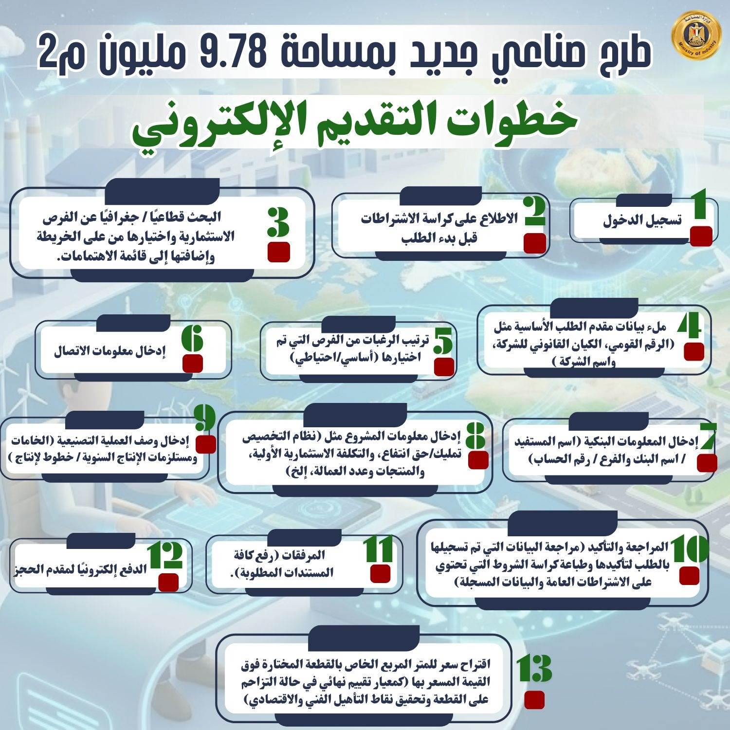 ويتم التقديم إلكترونيًا بالكامل من خلال المنصة خلال الفترة من 1 إلى 15 مارس، على أن يتم إعلان نتائج التخصيص مطلع أبريل بعد انتهاء الهيئة العامة للتنمية الصناعية من دراسة الطلبات وفقًا لمعايير مفاضلة إلكترونية.