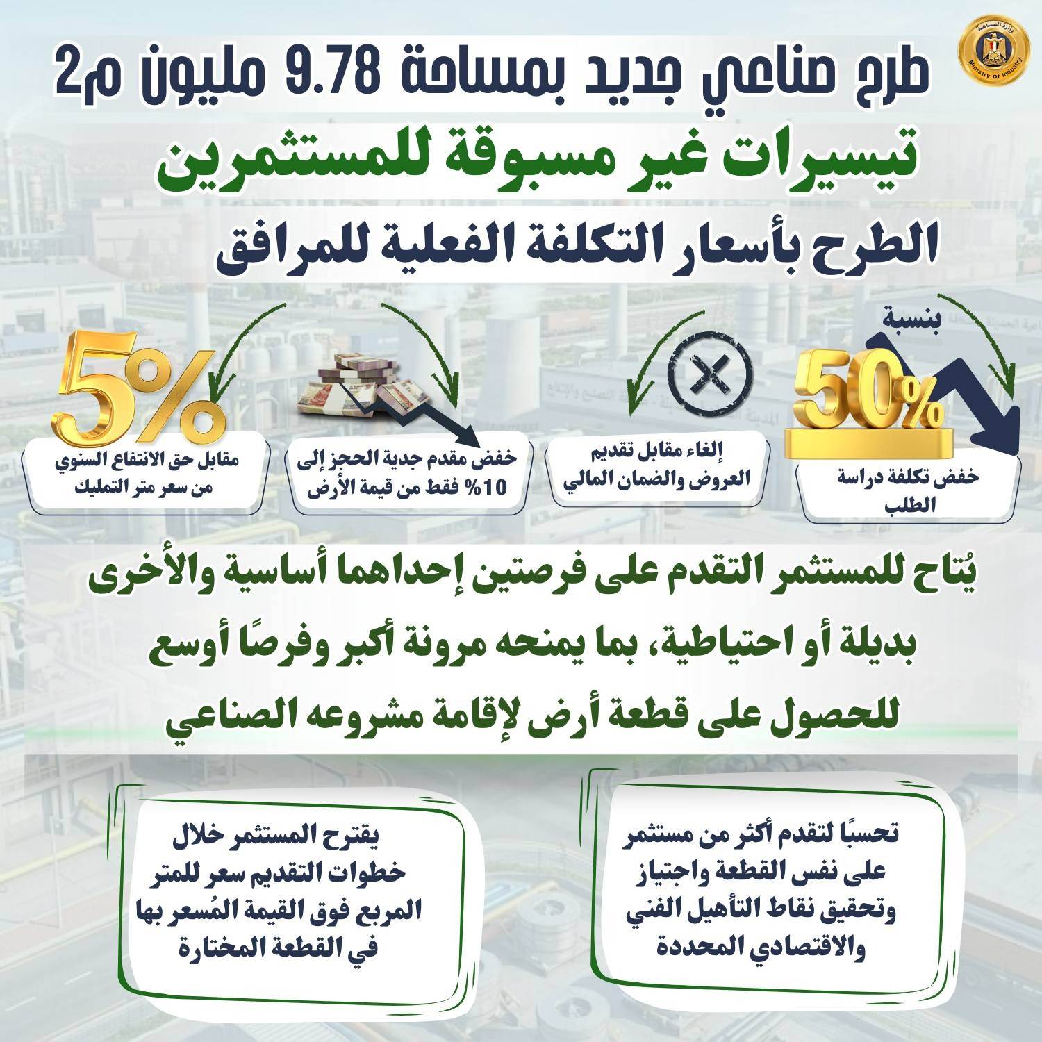 وتُطرح الأراضي بنظامي التمليك أو حق الانتفاع بأسعار التكلفة الفعلية للمرافق، مع حزمة من التيسيرات للمستثمرين تشمل خفض تكلفة دراسة الطلب بنسبة 50%، وإلغاء مقابل تقديم العروض والضمان المالي، وتخفيض مقدم جدية الحجز إلى 10% من قيمة الأرض، إضافة إلى إتاحة التقدم على فرصتين إحداهما أساسية والأخرى احتياطية لزيادة فرص الحصول على الأراضي الصناعية.