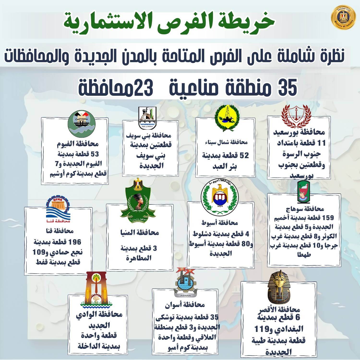 أعلنت وزارة الصناعة طرح 1272 قطعة أرض صناعية كاملة المرافق بإجمالي مساحة تصل إلى نحو 9.78 مليون متر مربع، ضمن الطرح الثالث عشر للأراضي الصناعية عبر منصة منصة مصر الصناعية الرقمية، موزعة على 35 منطقة صناعية في 23 محافظة، وذلك قبل يومين من غلق باب التقديم المقرر في 15 مارس. وتتراوح مساحات الأراضي المطروحة بين 118 مترًا مربعًا و400 ألف متر مربع في بعض المناطق الصناعية، لتلبية احتياجات مختلف أحجام المشروعات، وتشمل أنشطة صناعية متنوعة مثل الصناعات الغذائية والهندسية والكيماوية والدوائية والغزل والنسيج ومواد البناء.