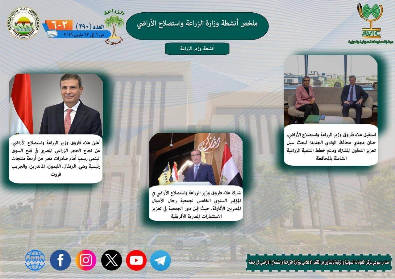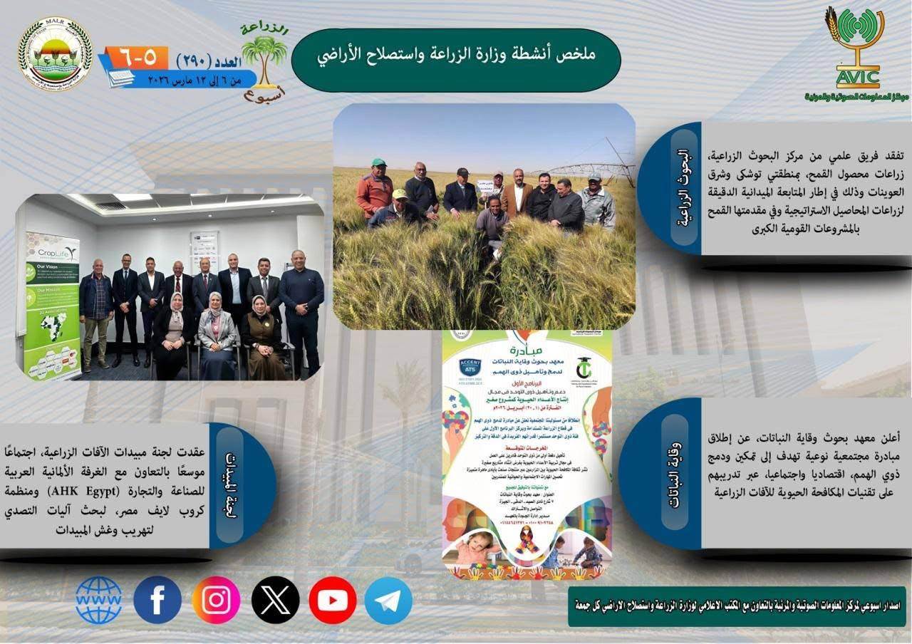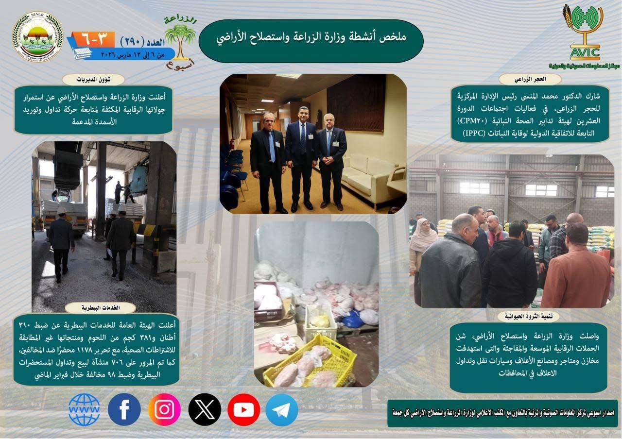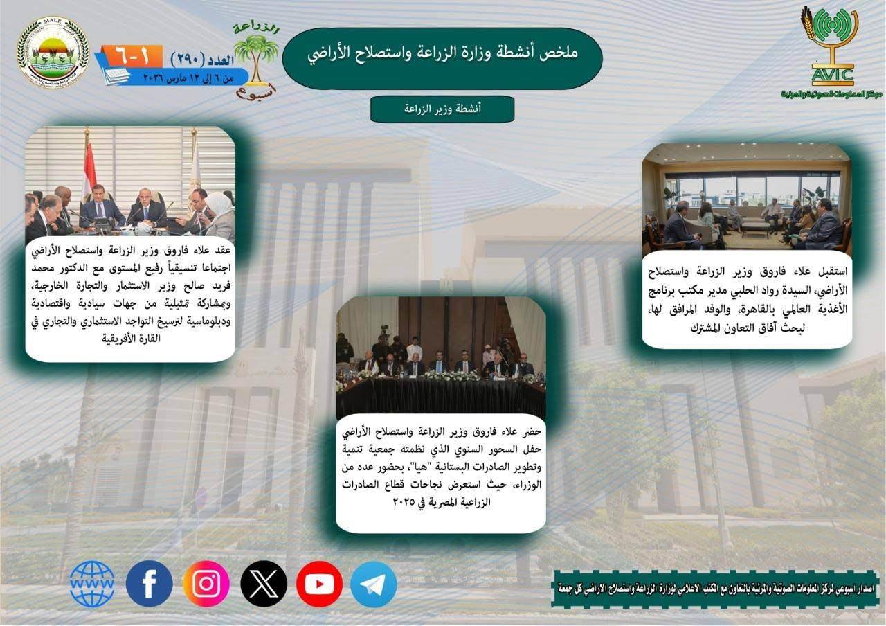 يذكر ان مركز المعلومات الصوتية والمرئية، والمكتب الاعلامي للوزارة، يصدران الجمعة من كل اسبوع، انفوجرافا وفيديو باسم: الزراعة في اسبوع، لالقاء الضوء على ملخص ما تم من انشطة وجهود، بكافة القطاعات والهيئات، التابعة للوزارة.