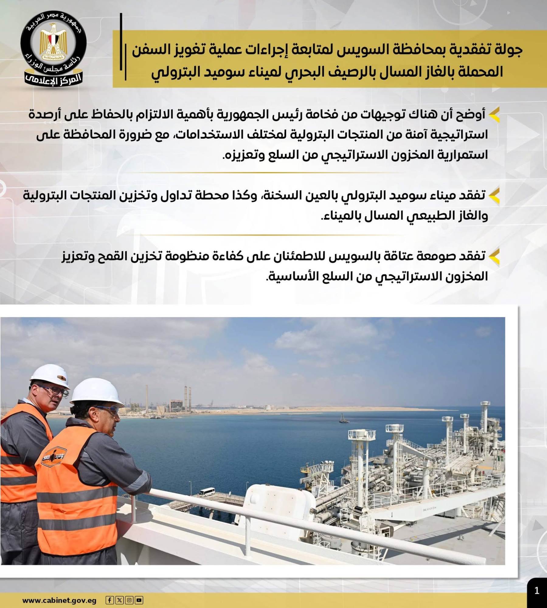 وتضمنت الأنشطة، قيام رئيس الوزراء بجولة تفقدية بمحافظة السويس لمتابعة إجراءات عملية تغويز السفن المحملة بالغاز المسال بالرصيف البحري لميناء سوميد البترولي، موضحًا أن هناك توجيهات من فخامة رئيس الجمهورية بأهمية الالتزام بالحفاظ على أرصدة استراتيجية آمنة من المنتجات البترولية لمختلف الاستخدامات، مع ضرورة المحافظة على استمرارية المخزون الاستراتيجي من السلع وتعزيزه.