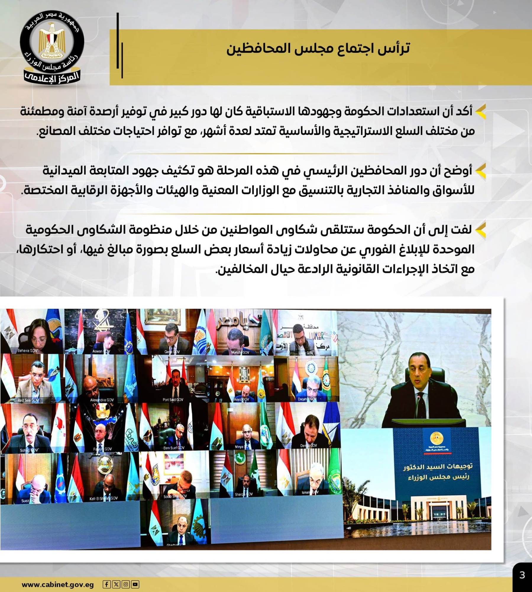 وترأس رئيس الوزراء اجتماع مجلس المحافظين، مؤكدًا أن استعدادات الحكومة وجهودها الاستباقية كان لها دور كبير في توفير أرصدة آمنة ومطمئنة من مختلف السلع الاستراتيجية والأساسية تمتد لعدة أشهر، مع توافر احتياجات مختلف المصانع.