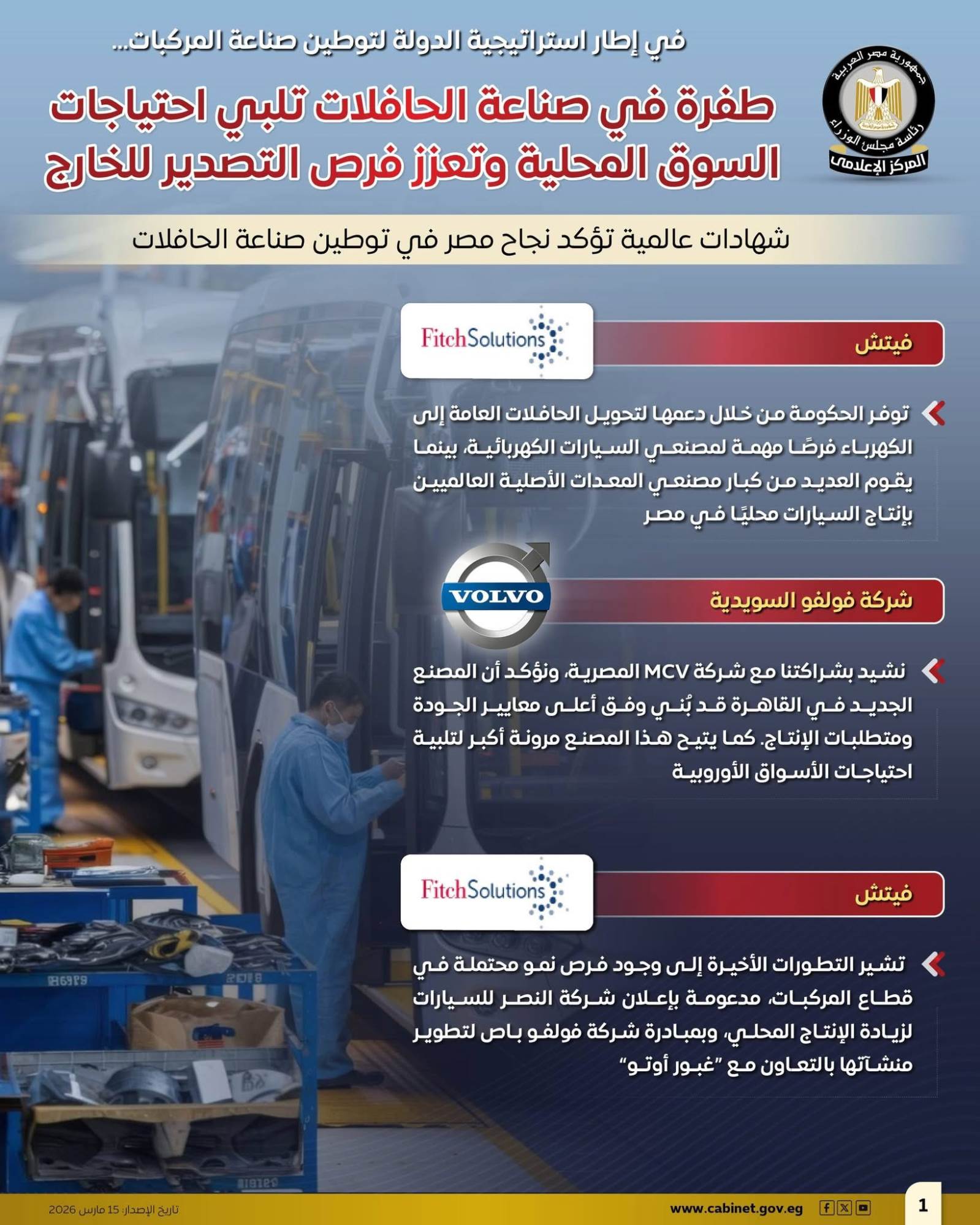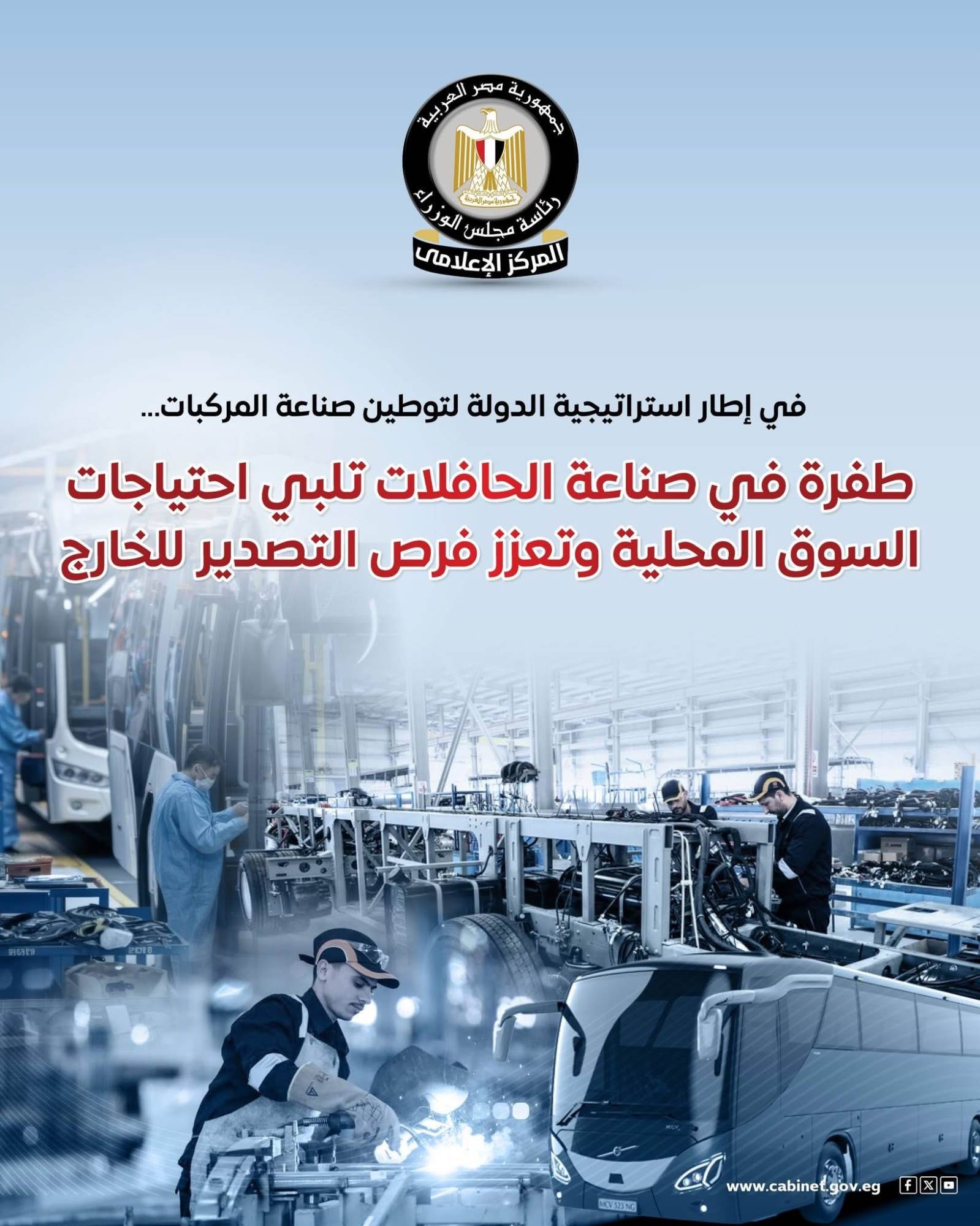 نشر المركز الإعلامي لمجلس الوزراء عددًا من الإنفوجرافات عبر منصاته الرسمية على مواقع التواصل الاجتماعي، سلطت الضوء على ما شهدته صناعة الحافلات من طفرة أسهمت في تلبية احتياجات السوق المحلي، والانطلاق بقوة نحو التصدير، وذلك في إطار استراتيجية الدولة لتوطين صناعة المركبات وتعميق التصنيع المحلي.