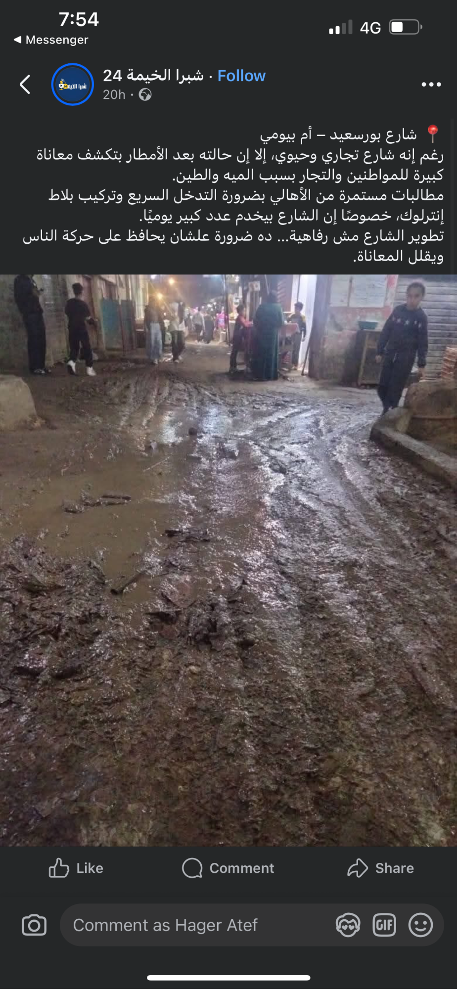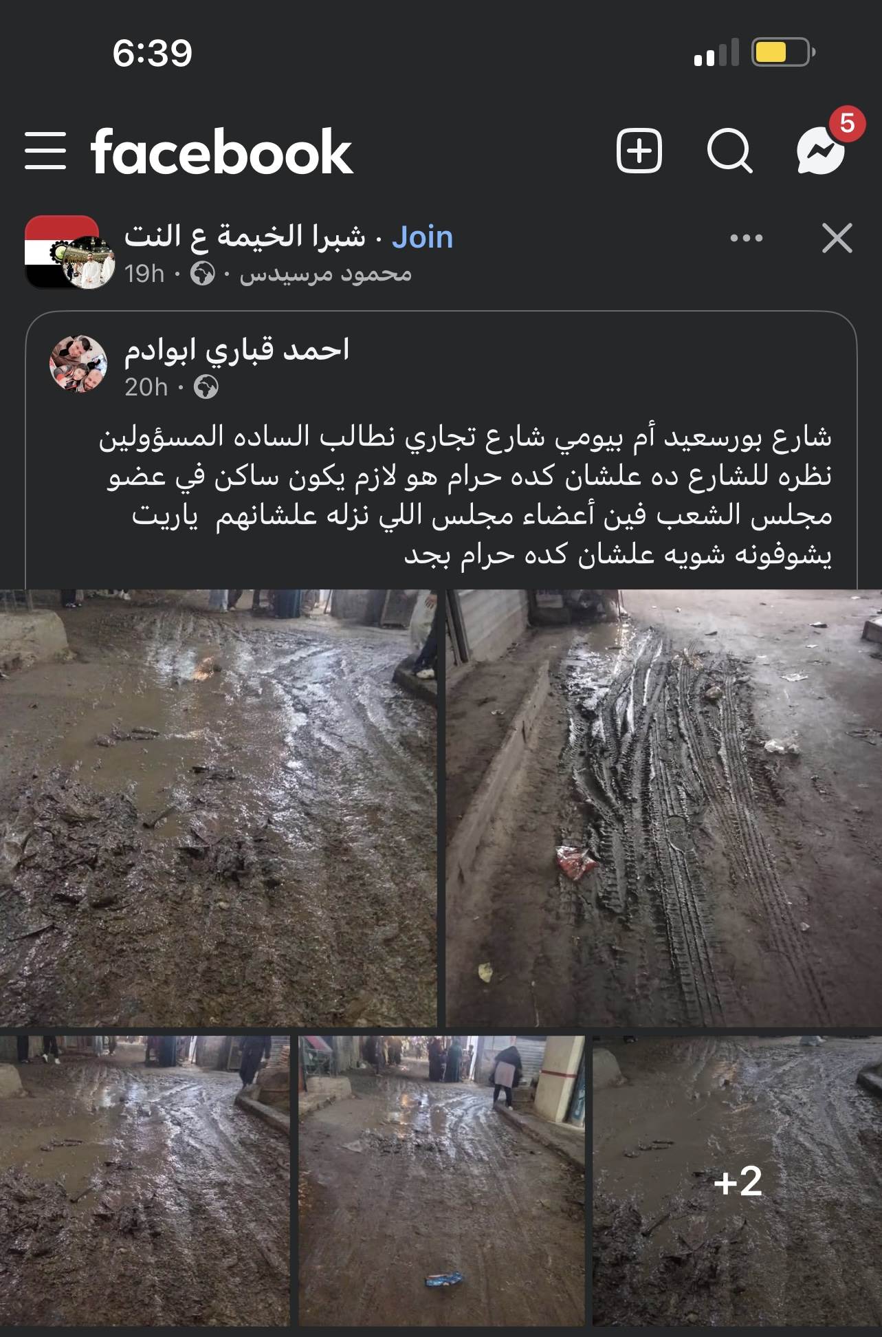 يشهد شارع بورسعيد بمنطقة أم بيومي شبرا الخيمه أول؛ حالة من التدهور الملحوظ، خاصةً عقب سقوط الأمطار، حيث تتحول أجزاء كبيرة منه إلى برك من المياه والطين، ما يسبب معاناة يومية للمواطنين والتجار.