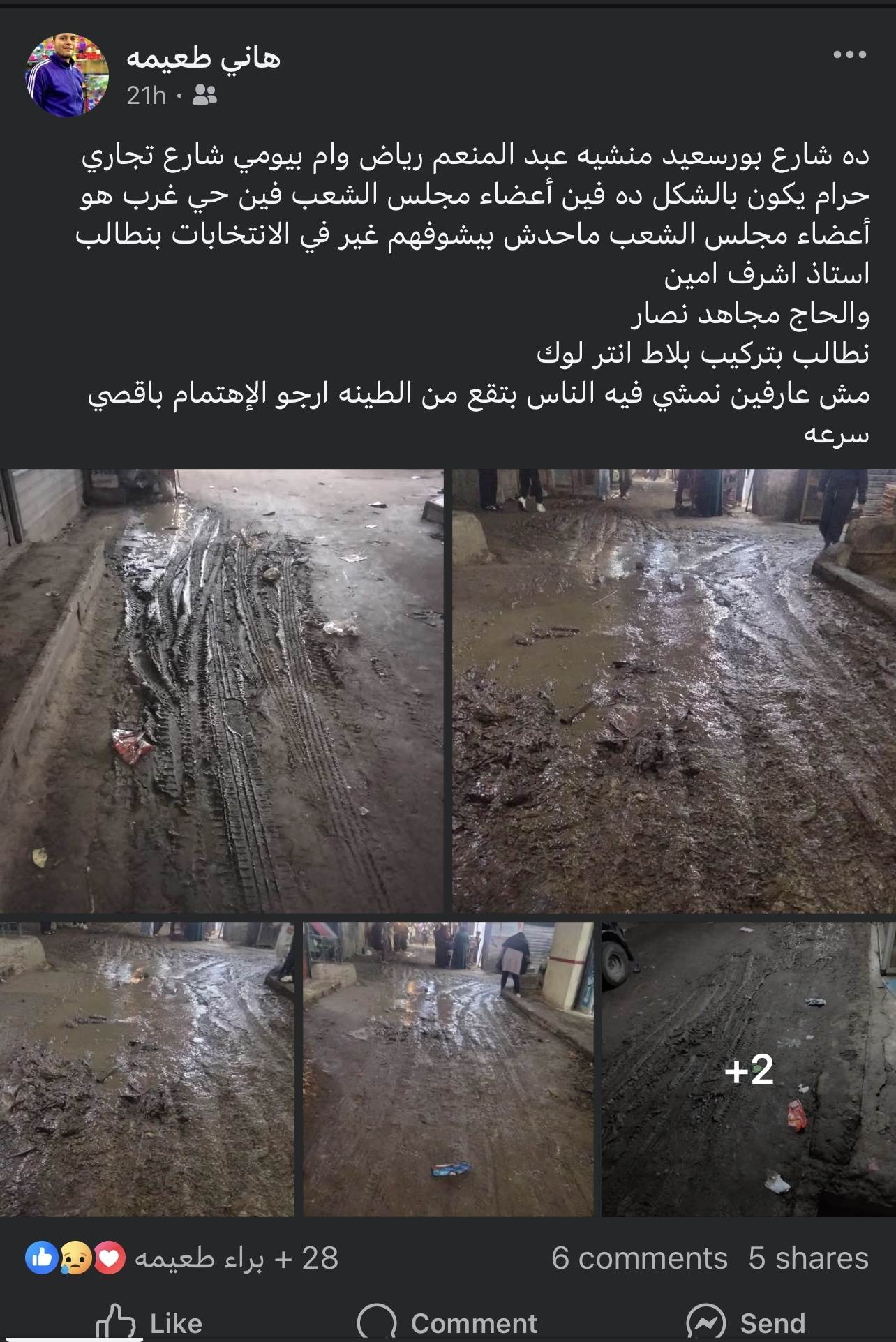 قال هاني طعيمة، أحد أهالي منطقة أم بيومي، إن شارع بورسعيد رغم كونه شارعًا تجاريًا حيويًا يعاني من تدهور شديد في حالته، خاصة عقب سقوط الأمطار، حيث يتحول إلى مساحات من الطين تعيق حركة المواطنين.