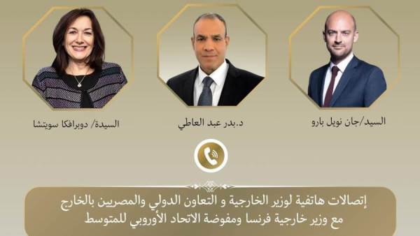 تلقي د. بدر عبد العاطي وزير الخارجية والتعاون الدولي والمصريين بالخارج اتصالاً هاتفياً من "جان نويل بارو" وزير خارجية فرنسا، كما تواصل مع "دوبرافكا سويتشا"، مفوضة الاتحاد الأوروبي للمتوسط، يوم الاحد ٢٩ مارس، حيث تم تناول التطورات المتسارعة في الإقليم والتصعيد العسكري الذي تشهده المنطقة، والجهود المبذولة لخفض التصعيد.