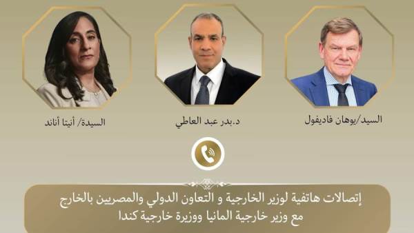 تلقى د. بدر عبد العاطي وزير الخارجية والتعاون الدولي والمصريين بالخارج، اتصالين هاتفيين يوم الاثنين ٦ أبريل من كل من "يوهان فاديفول" وزير خارجية ألمانيا، و "أنيتا أناند" وزيرة خارجية كندا، لبحث مستجدات الوضع الإقليمي وجهود خفض التصعيد.
