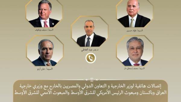 في إطار جهود خفض التصعيد واحتواء الموقف العسكري المتصاعد بالمنطقة، واصل د. بدر عبد العاطي وزير الخارجية والتعاون الدولي والمصريين بالخارج اتصالاته المكثفة حيث جرت اتصالات بين وزير الخارجية مع د. فؤاد حسين نائب رئيس مجلس الوزراء وزير خارجية جمهورية العراق، ومحمد إسحاق دار نائب رئيس الوزراء ووزير خارجية باكستان، وستيف ويتكوف المبعوث الأمريكي الخاص للشرق الأوسط، زجان أرنو المبعوث الشخصي للسكرتير العام للأمم المتحدة للشرق الأوسط يوم الاثنين ٦ أبريل.