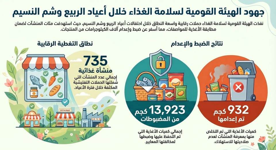 في إطار استعداداتها المكثفة لأعياد الربيع وشم النسيم، كثّفت الهيئة القومية لسلامة الغذاء حملاتها الرقابية على مستوى جميع محافظات الجمهورية خلال الفترة التي سبقت الأعياد، وذلك ضمن خطة استباقية تستهدف ضمان سلامة الغذاء، وتشديد الرقابة على تداول الأغذية، وحماية صحة المواطنين، لا سيما مع تزايد الإقبال على المنتجات الغذائية الموسمية، وعلى رأسها الأسماك المملحة والمدخنة.