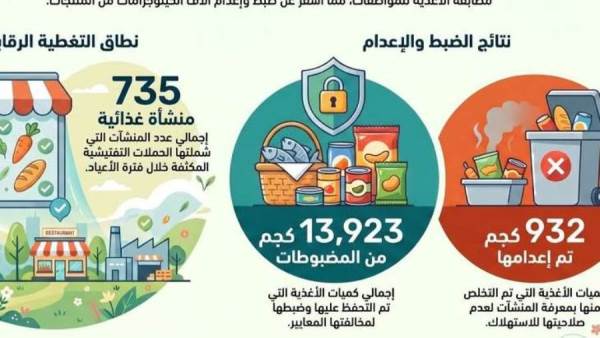 وقد تم تنفيذ (735) مأمورية رقابية شملت المرور على مختلف المنشآت الغذائية التي تتعامل مع هذه المنتجات، للتحقق من مدى الالتزام بالضوابط الفنية والصحية.