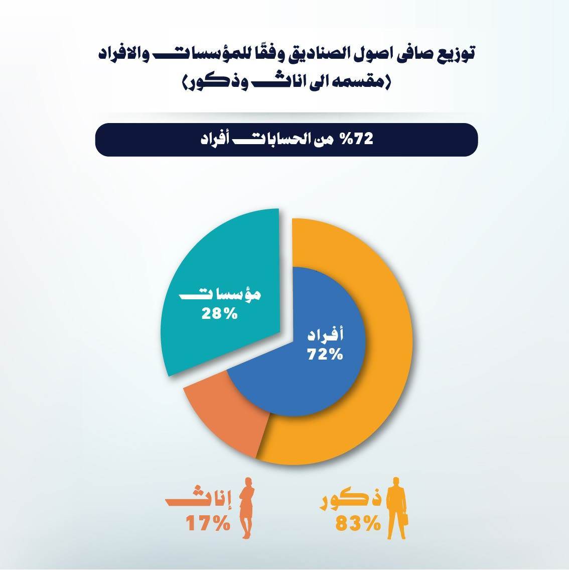 واوضح التقرير أن حسابات الأفراد تستحوذ على نحو 72% من إجمالي الحسابات، يتوزعون بواقع 83% للذكور و17% للإناث، فيما تمثل حسابات المؤسسات نحو 28% من الإجمالي.