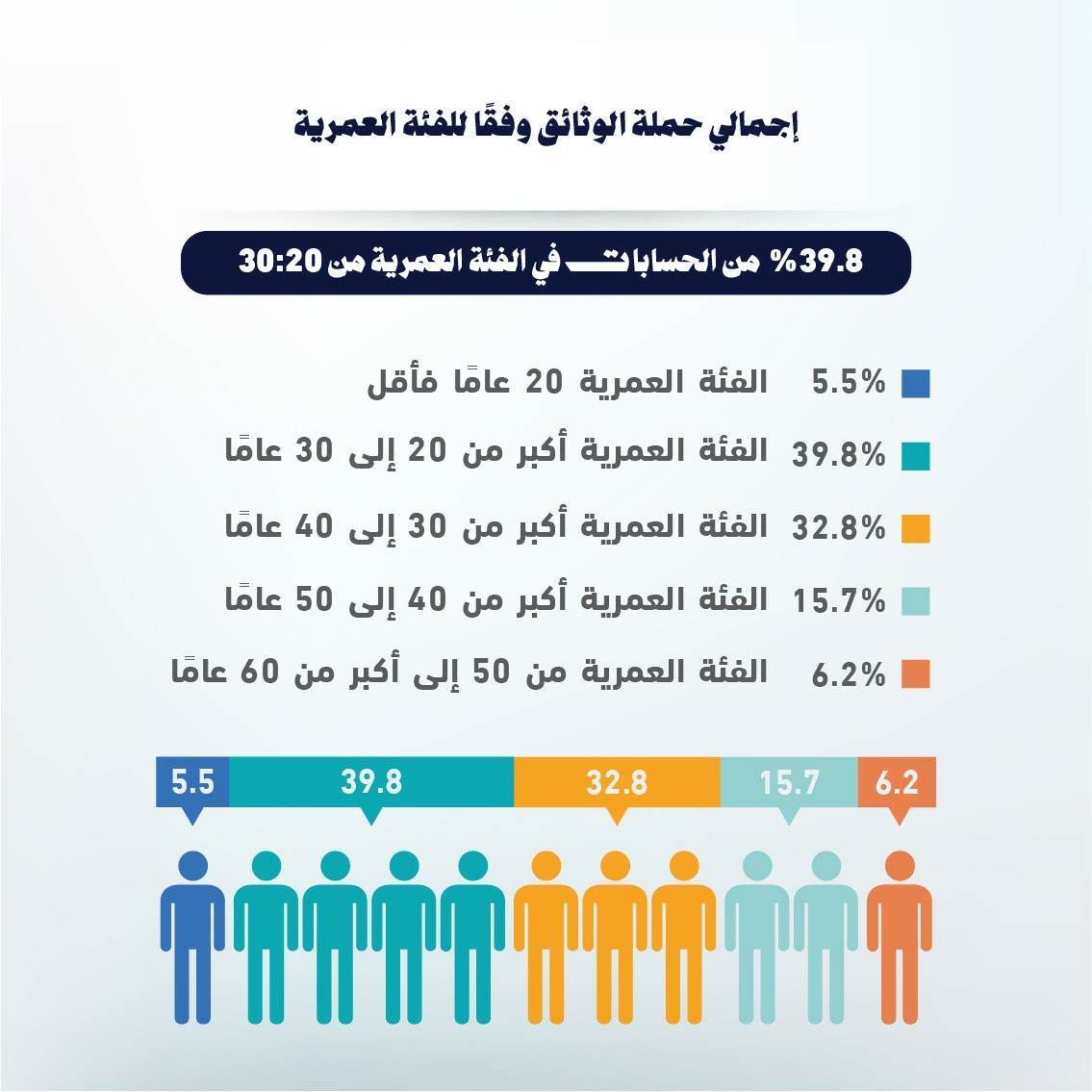 كما أشار إلى أن الفئة العمرية " أكبر من 20 إلى 30 عامًا "استحوذت على النسبة الأكبر من حسابات هذا النوع من الاستثمار، بنحو 39.8%.