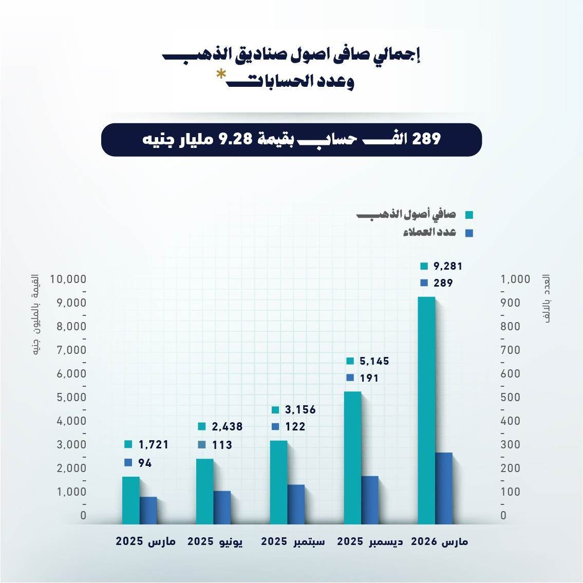 أظهرت أحدث التقارير الصادرة من الهيئة العامة للرقابة المالية، أن إجمالي قيمة صافى أصول صناديق الاستثمار في الذهب بلغ قيمته 9.28 مليار جنيه بنهاية مارس 2026، وذلك من خلال 289 ألف حساب.