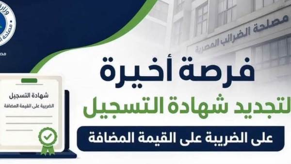 أكدت رئيس مصلحة الضرائب المصرية رشا عبد العال، أنه في ضوء التنسيق والتكامل بين المصلحة ومصلحة الجمارك، تم مد مهلة سريان شهادات تسجيل ضريبة القيمة المضافة حتى 30 يونيو 2026، وذلك وفقا لتوجيهات وزير المالية أحمد كجوك، بالتيسير على مجتمع الأعمال ودعم استقرار التعاملات التجارية.
