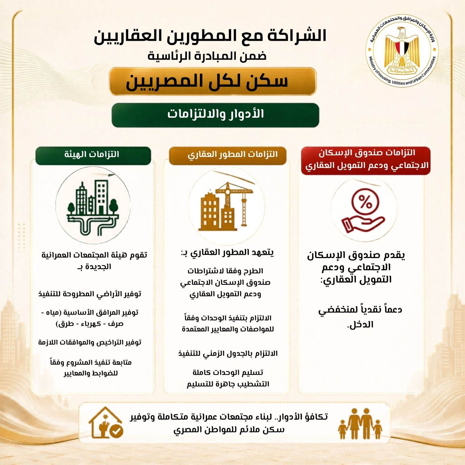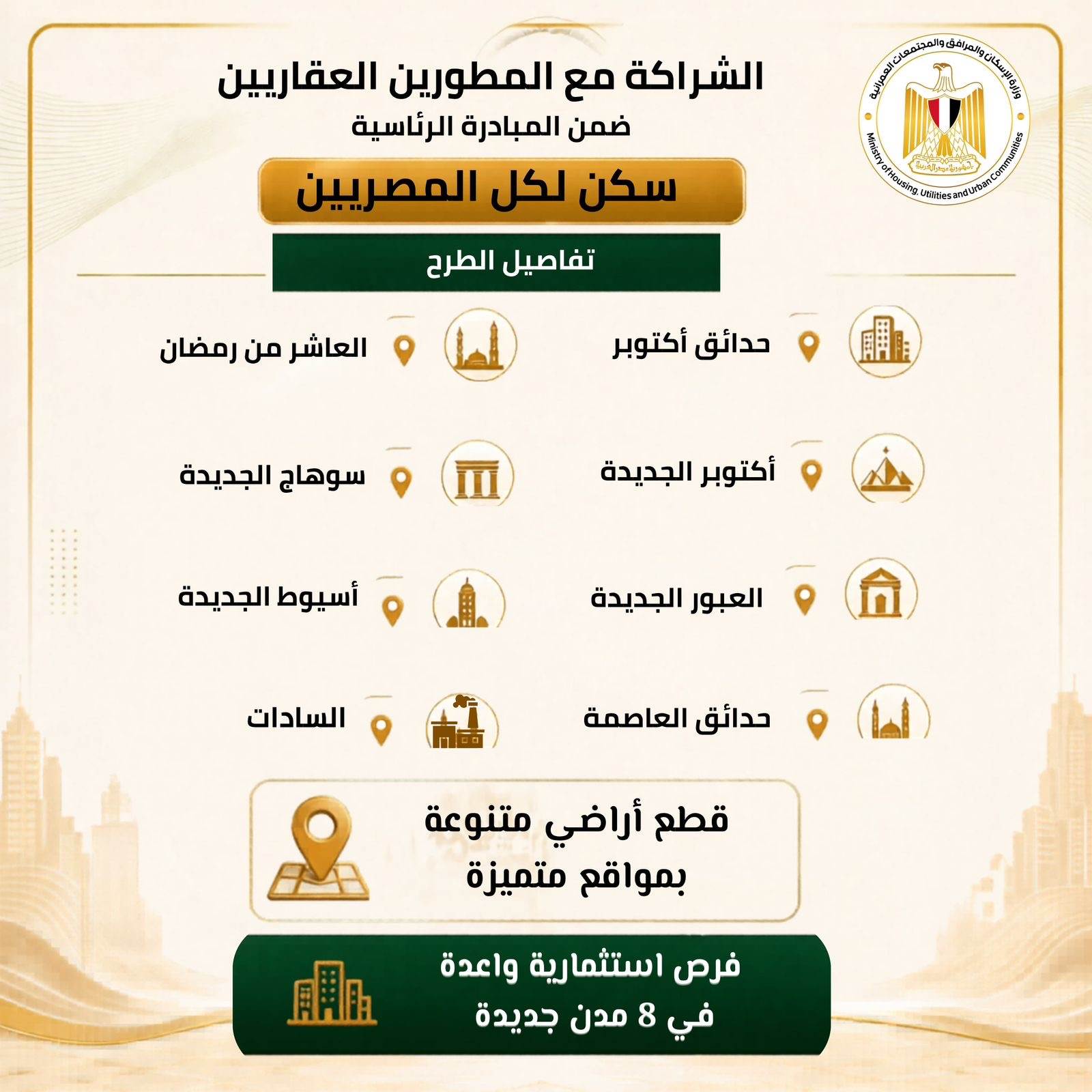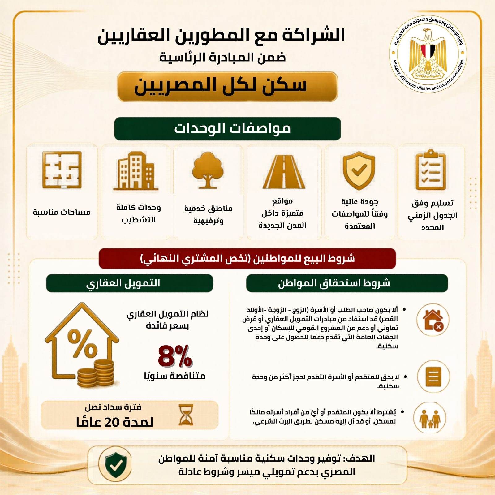 وتستهدف المبادرة إتاحة فرص استثمارية جديدة للمطورين العقاريين، من خلال نظام الشراكة الذي يحقق منفعة متبادلة، حيث توفر الدولة الأراضي والبنية الأساسية، بينما يتولى المطورون تنفيذ المشروعات وفق معايير محددة تضمن الالتزام بالجداول الزمنية ومستويات الجودة المطلوبة. كما يسهم هذا النموذج في تخفيف الأعباء التمويلية عن الدولة، مع ضمان طرح وحدات بأسعار تنافسية.