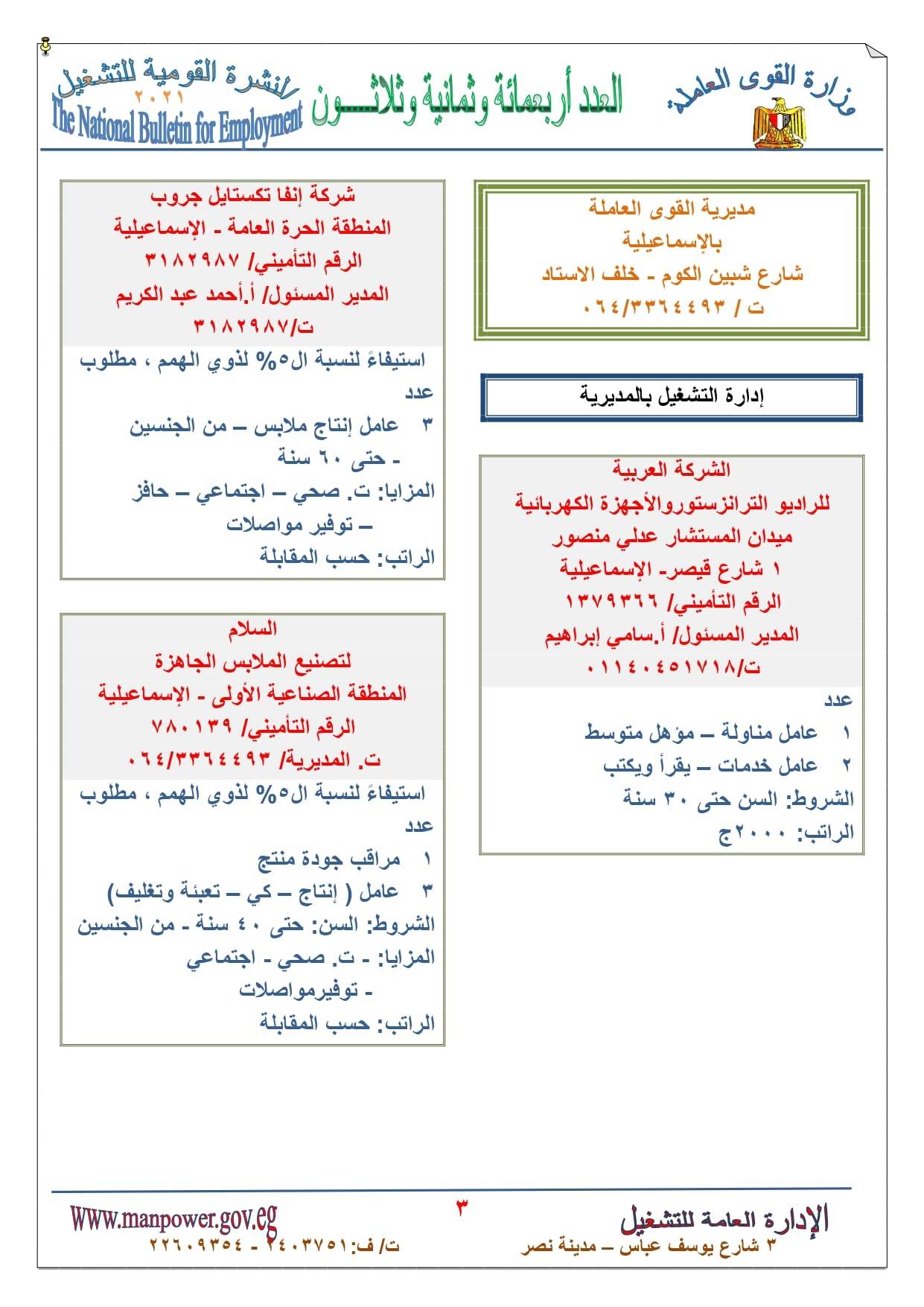 ووفرت مديرية القوى العاملة بالإسماعيلية فرص عمل شملت: عامل مناولة ، وعامل خدمات ، و 3 عمال إنتاج ملابس ، و مراقب جودة ، و 3 عمال إنتاج وكي ملابس وتعبئة وتغليف.