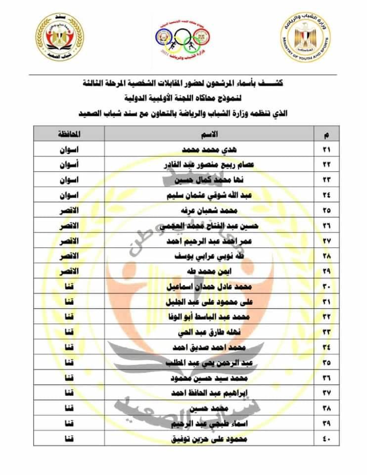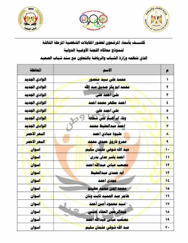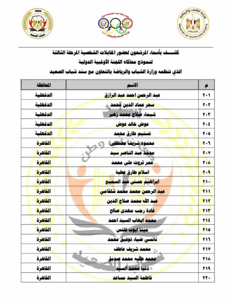 يذكر أن نموذج محاكاة اللجنة الأوليمبية الدولية هو مشروع يهدف إلى محاكاة عمل اللجنة الأوليمبية الدوليه والهيكل التنفيذى واللجان وطرق الانتخاب وغيرها، وقد تم تحديد موعد المقابلات الشخصية لتكون على ثلاثة أيام حسب التوزيع الجغرافى للمحافظات، وتكون المقابلات يومين بوزارة الشباب والرياضة وهما الثلاثاء والأربعاء 12 و13 اكتوبر ويوم بمديرية الشباب والرياضة بسوهاج لمحافظات الصعيد وتيسيرا عليهم لطول المسافة.
