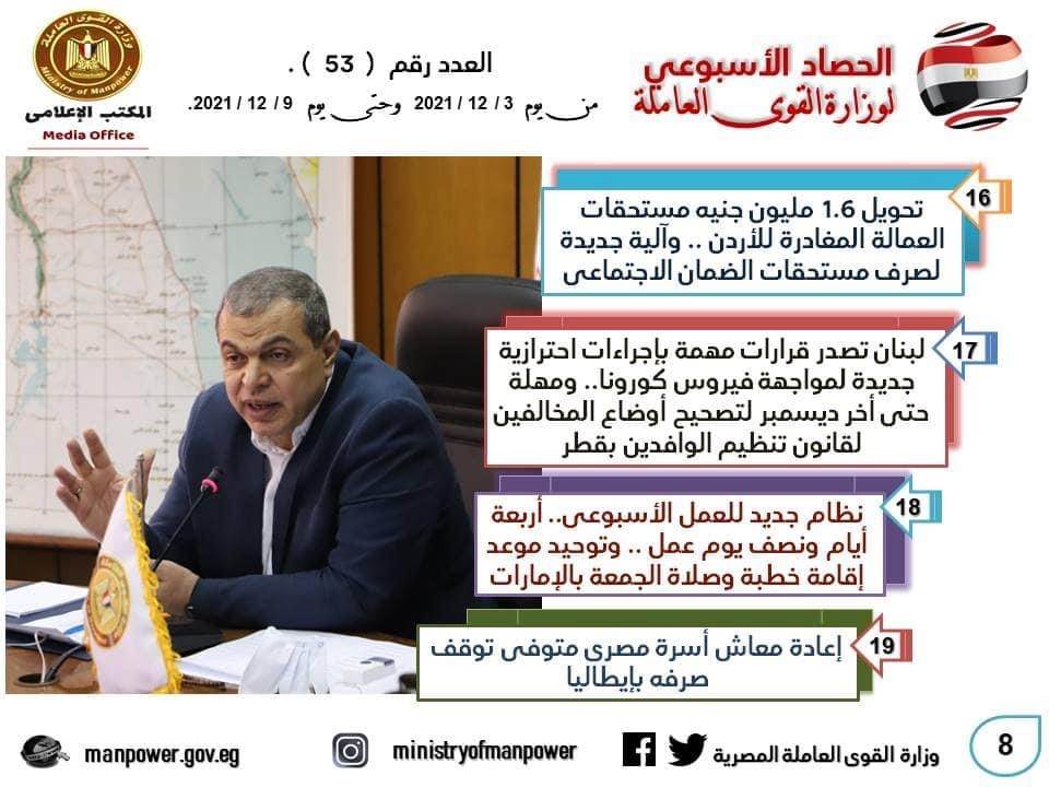 وامتد الحصاد ليشمل نجاح مكتب التمثيل العمالي التابع للوزارة بالسفارة المصرية بعمان-الأردن، بالمتابعة اللحظية والجهود المبذولة والمقابلات مع المسئولين بمؤسسة الضمان الاجتماعي بالأردن، واستكمالا لما تم تحويله سابقا، تم تحويل القائمة الـ 59 من مستحقات الضمان الاجتماعي لنحو 55 عامل مصري لدى المؤسسة غادروا عمان نهائيا.
