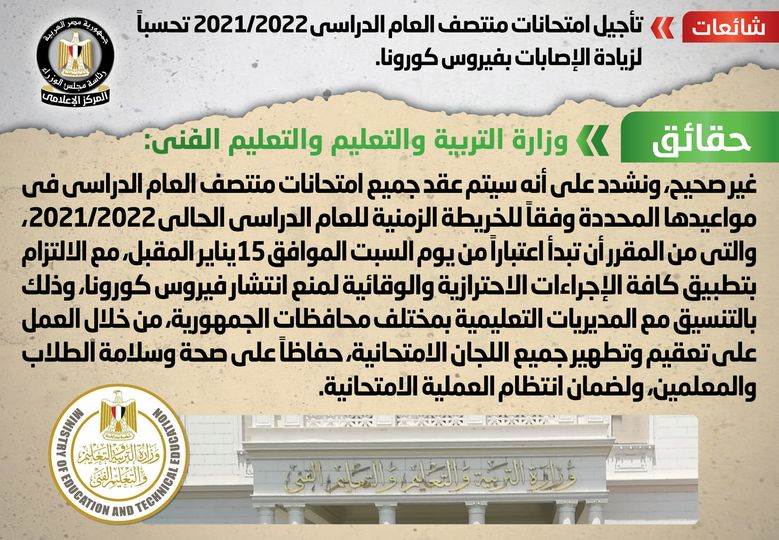 انتشر في بعض المواقع الإلكترونية وصفحات التواصل الاجتماعي أنباء بشأن تأجيل امتحانات منتصف العام الدراسي 2021/2022 تحسباً لزيادة الإصابات بفيروس كورونا، وقد قام المركز الإعلامي لمجلس الوزراء بالتواصل مع وزارة التربية والتعليم والتعليم الفني، والتي نفت تلك الأنباء، مُؤكدةً أنه لا صحة لتأجيل امتحانات منتصف العام الدراسي 2021/2022 تحسباً لزيادة الإصابات بفيروس كورونا، مُشددةً على أنه سيتم عقد جميع امتحانات منتصف العام الدراسي في مواعيدها المحددة وفقاً للخريطة الزمنية للعام الدراسي الحالي 2021/2022، والتي من المقرر أن تبدأ اعتباراً من يوم السبت الموافق 15يناير المقبل.
