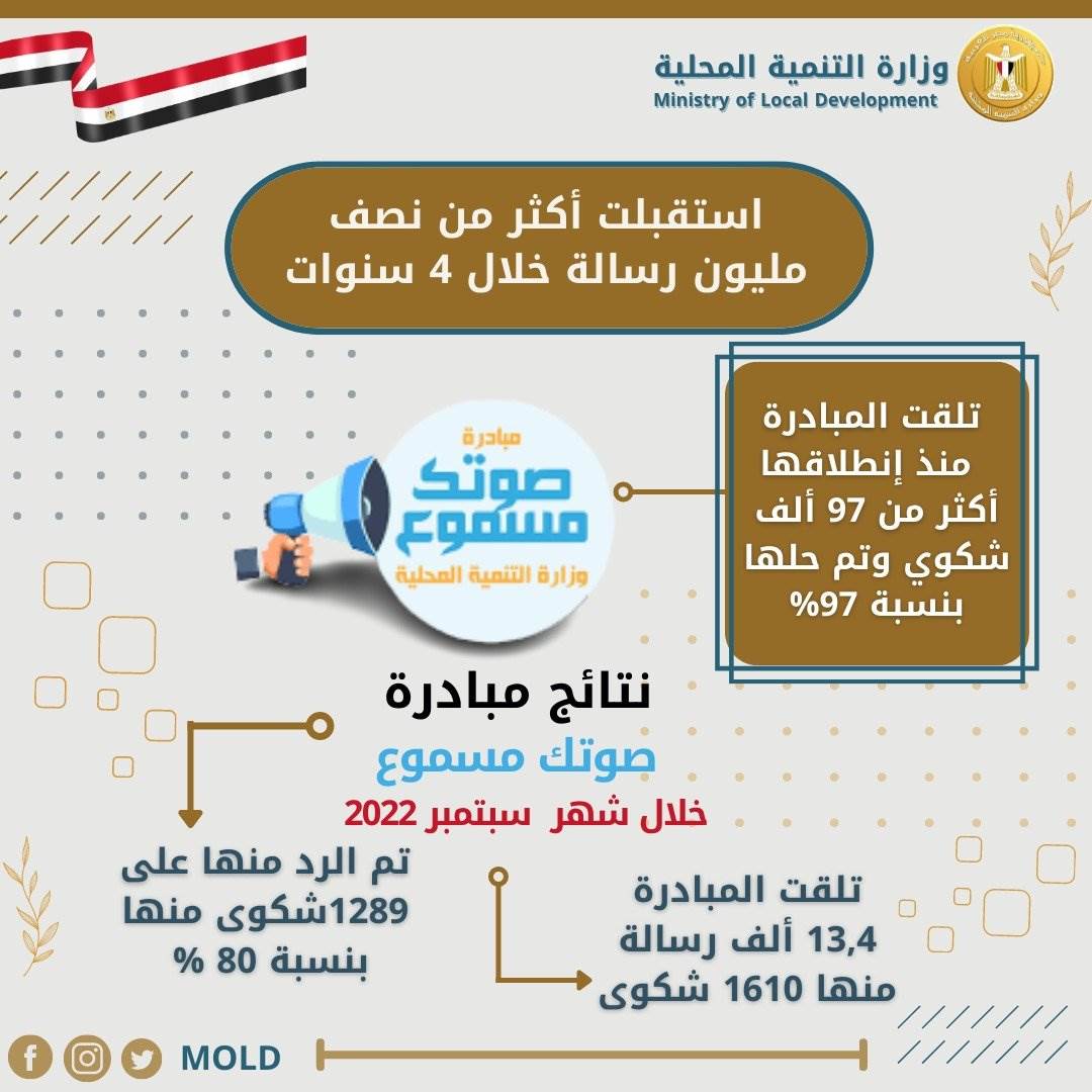استكمالاً لأهداف خطة عمل وزارة التنمية المحلية فى تلقى وفحص وتوجيه جميع الشكاوى ، والرد عليها إلكترونياً من خلال مبادرة" صوتك مسموع "والتى أنشأتها الوزارة منذ 4 سنوات ، تحت رعاية رئيس مجلس الوزراء ، بما يجعلها قناة تواصل رسمية ذو اتجاهين بين المواطن والحكومة والاجهزة التنفيذية بالمحافظات.