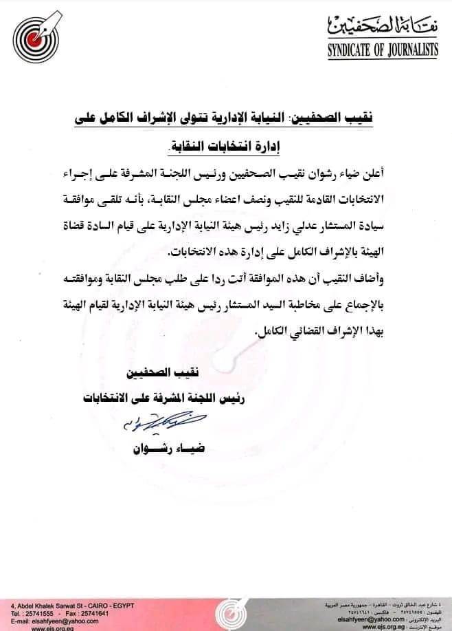 أعلن ضياء رشوان نقيب الصحفيين، رئيس اللجنة المشرفة على إجراء الانتخابات القادمة للنقيب ونصف أعضاء مجلس النقابة، عن تلقيه موافقة من المستشار عدلي زايد رئيس هيئة النيابة الإدارية على قيام قضاة الهيئة بالإشراف الكامل على إدارة الانتخابات.