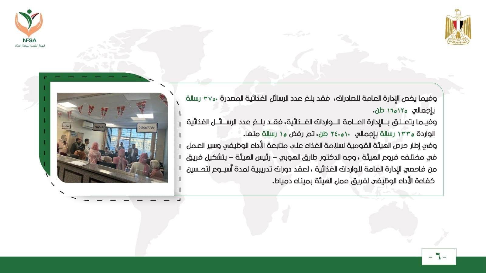 وفي إطار حرص الهيئة القومية لسلامة الغذاء على متابعة الأداء الوظيفي وسير العمل في مختلف فروع الهيئة ، وجه الدكتور طارق الهوبي – رئيس الهيئة – بتشكيل فريق من فاحصي الإدارة العامة للواردات الغذائية ، لعقد دورات تدريبية لمدة أسبوع لتحسين كفاءة الأداء الوظيفى لفريق عمل الهيئة بميناء دمياط.