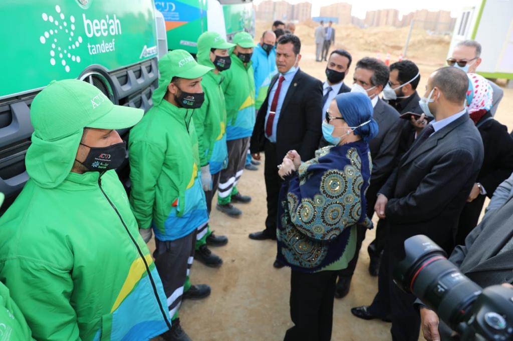 كما تحدثت وزيرة البيئة إلى عدد من العاملين بمنظومة نظافة العاصمة الإدارية حول التدريب والتأهيل الذي تلقوه قبل توليهم مهام عملهم، وضرورة الالتزام بمعايير السلامة والأمان والإجراءات الاحترازية خاصة في ظل مواجهة انتشار فيروس كورونا المستجد، حيث أكد مسؤولو الشركة أن العاملين بالمنظومة ويصل عددهم بالمرحلة الأولى ١٢٠ عامل وسائق، يتم اختيارهم بعناية ويلتقون مجموعة من التدريبات المتنوعة على أحدث طرق التعامل الآمن مع المخلفات آليات استدامة المعدات، وتأهيلهم للعمل كمقدمي خدمة بمنظور مختلف، بالإضافة إلى اختبار السائقين بالمركز المصري للقيادة الآمنة لتأهيلهم لممارسة مهامهم بأمان واستدامة.
