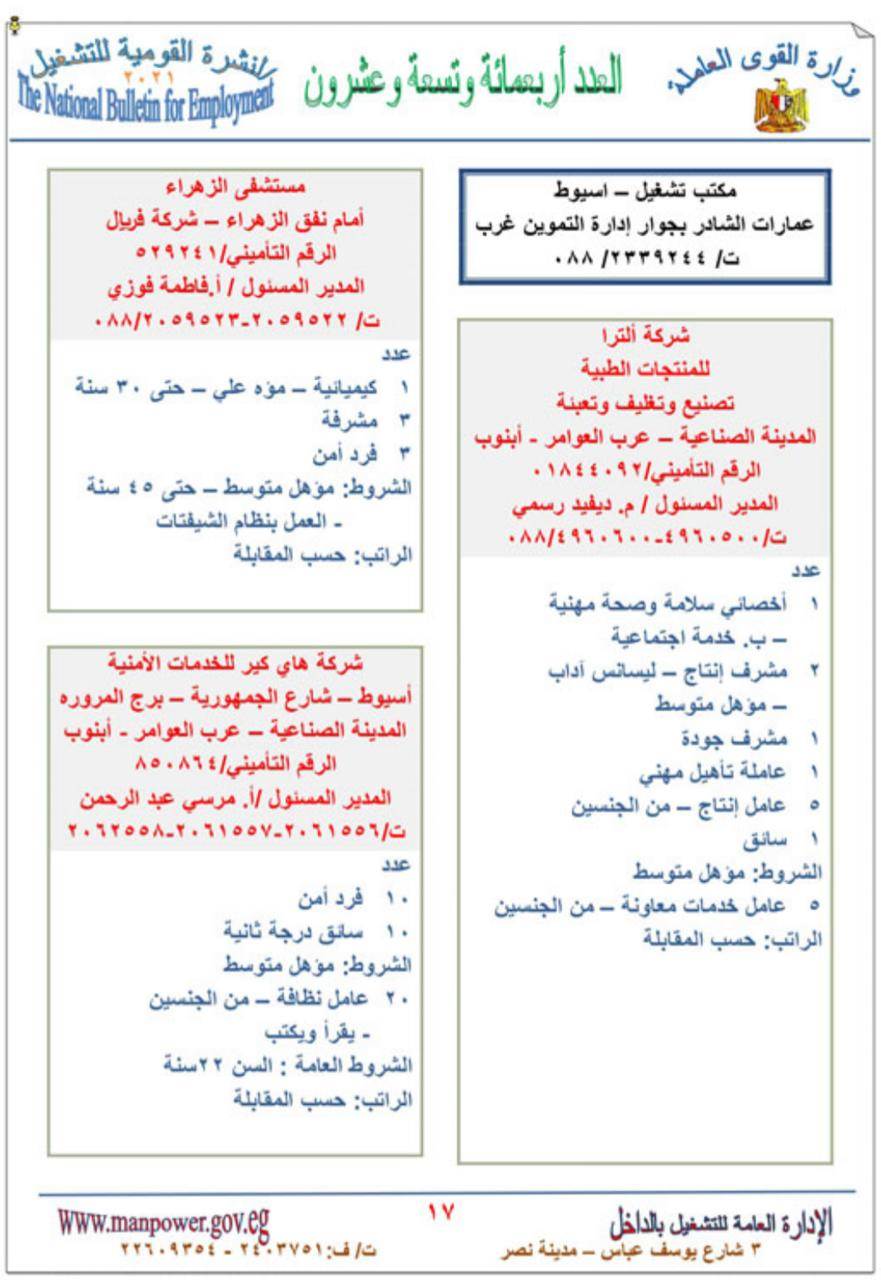 وهناك عدد من الوظائف فى أسيوط تضمنت : 240 فرد أمن، و كيميائية، و 3 مشرفة، وأخصائى سلامة وصحة مهنية، وعاملة تأهيل مهنى، و2 مشرف إنتاج، و5 عامل إنتاج، و5 عامل خدمات معاونة، و 10 سائق درجة ثانية، و 20 عامل نظافة، و 2 دليفرى، واخصائية تمويل، و 2 مسئول ائتمان .