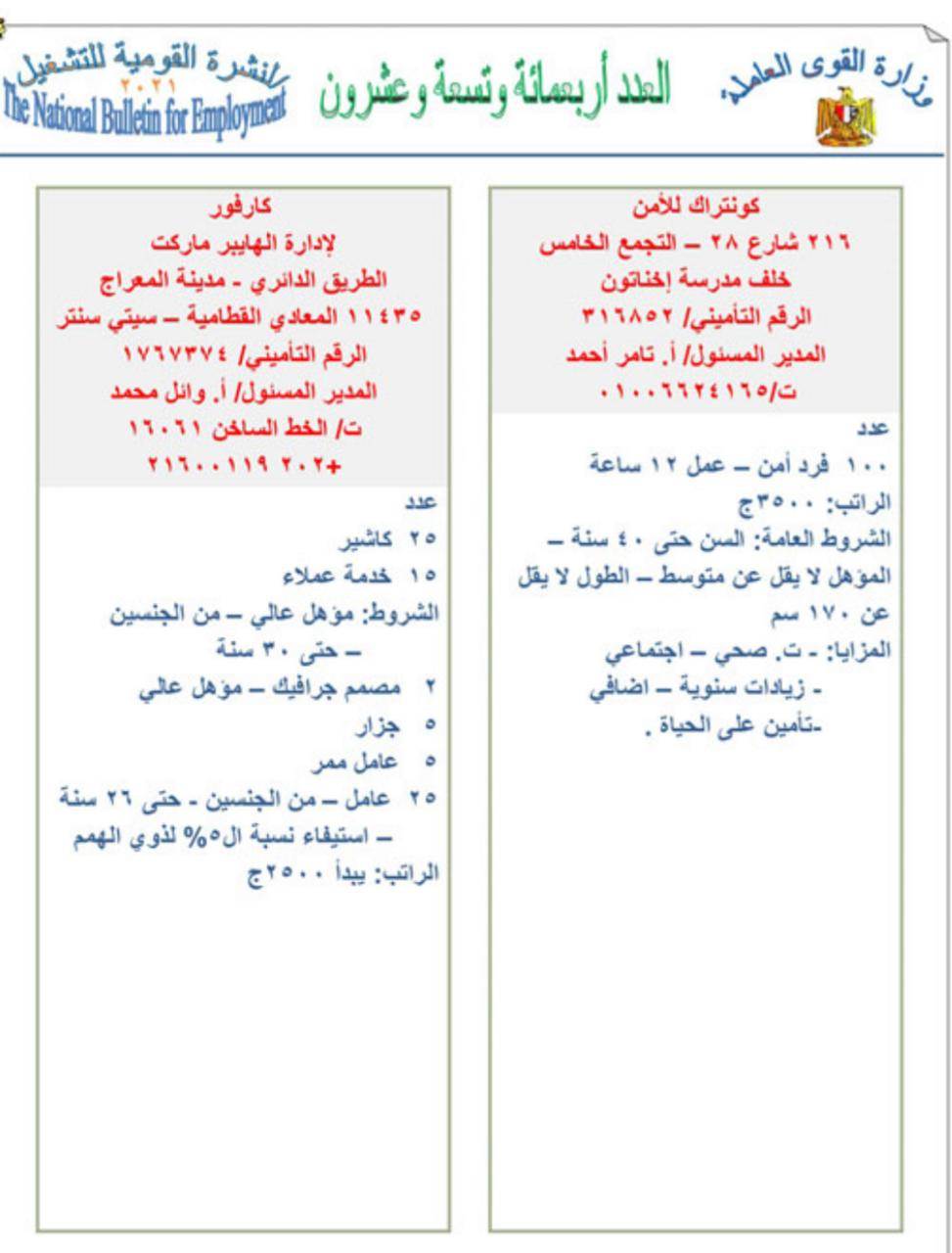 وفرص العمل المتوفرة بالقاهرة 400 ممثل خدمة عملاء، مؤهل عالى مع إجادة اللغة الفرنسية أو الألمانية، والرتب من 7 آلاف إلى 10آلاف، فضلا عن 300 ممثل خدمة عملاء استيفاء لنسبة الـ5% لذوى الهمم ويكون قادرا على العمل، مع إجادة الحاسب الآلي، و 1000 فرصة ممثل خدمة عملاء براتب من 2500 جنيه وحتى 4500 جنيه، و10 مهندسين تصميم وبحوث هندسية براتب من 7000 جنيه وحتى 9000 جنيه، و5 مسئولي مبيعات و7 إدارى، و120 فنى صيانة، و40 مندوب مبيعات، و 50 سائق درجة أولى وثانية، و20 مساعد فنى مصاعد، و5 سكرتارية، ويشترط إجادة اللغة الإنجليزية، و34 مشرف أمن، و391 فرد أمن، و30 كاشير، و30 شيف، و 10 موظفين مراقب كاميرات، و5 بائع إلكترونيات، و145 بائعاً بأقسام بقالة وخضروات وفاكهة .