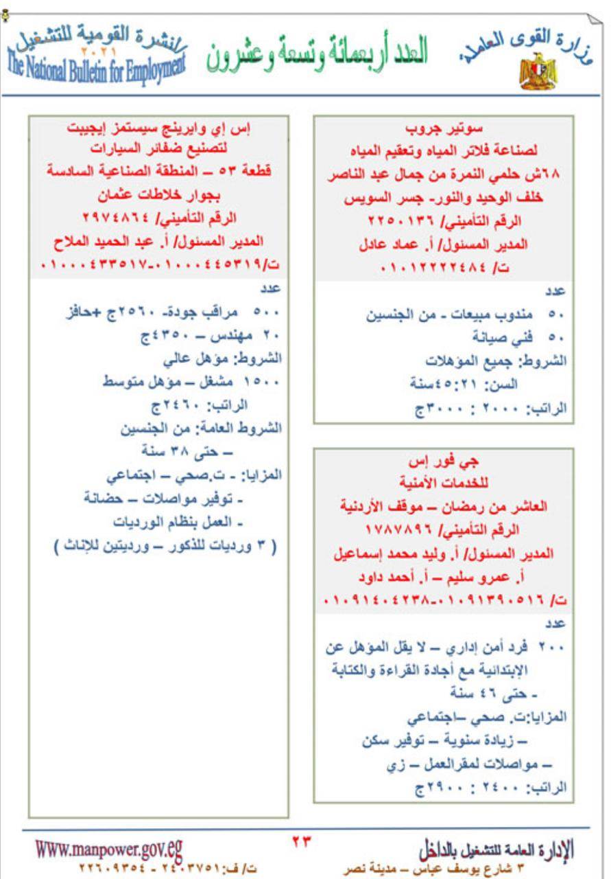 وفى المنيا يوجد 58 فرصة عمل متاحة، منها : 35 عامل حياكة، و مشرفة، وعامل بيع، و4 مسئول ائتمان، و2 مهندس سلامة وصحة مهنية براتب يصل لـ 4 آلاف جنيه، و15 أخصائى تسويق .