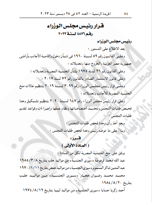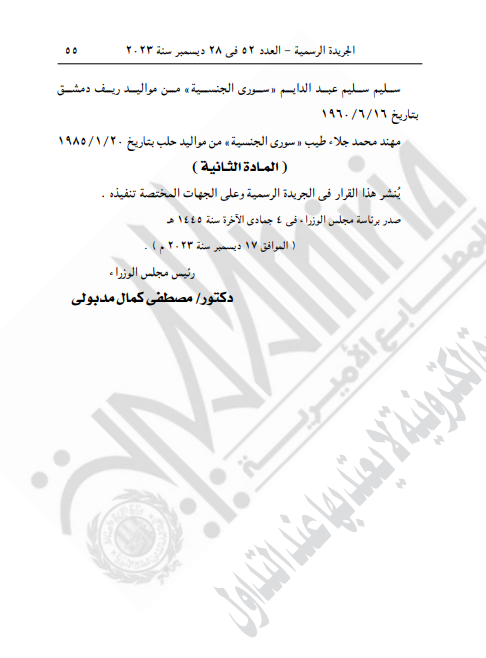 أصدر الدكتور مصطفى مدبولى رئيس الوزراء قرار بالموافقة على منح الجنسية المصرية لكل من عبد الله محمد قرموطة " سورى الجنسية" وعبد المتين شاكر المسموم" سورى الجنسية".