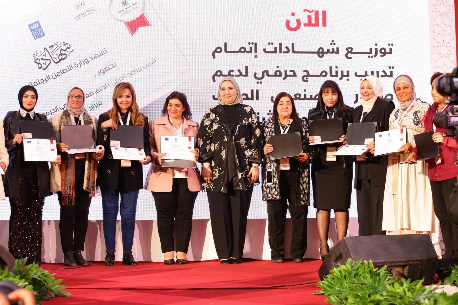 وسلمت القباج عددا من الشهادات لمتدربي برنامج "حرفي" لدعم صغار ومصنعي الحرف اليدوية والتراثية والذي تنفذه وزارة التضامن الاجتماعي بالتعاون مع البنك المركزي المصري.