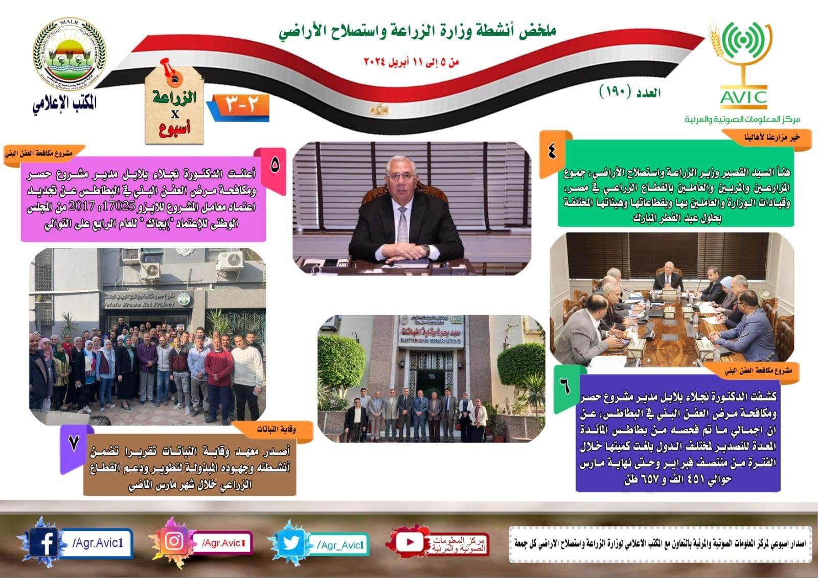 أصدر مركز المعلومات الصوتية والمرئية، التابع لوزارة الزراعة واستصلاح الاراضي، "الانفوجراف الاسبوعي" في نسخته رقم ١٩٠ حول الحصاد الاسبوعي لأهم أنشطة الوزارة، خلال الاسبوع الماضي في الفترة من ٥ وحتى ١١ أبريل الجاري، وذلك بالتعاون مع المكتب الاعلامي للوزارة، كما أصدر المركز ايضا ملخصا بالفيديو، حول انشطة الوزارة خلال نفس الفترة.